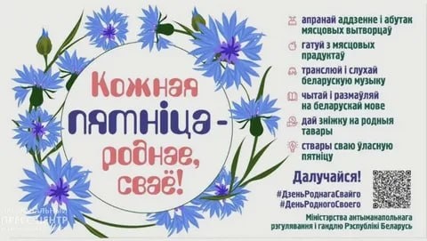 11 декабря Министерство антимонопольного регулирования и торговли Белоруссии (МАРТ) объявило о старте бессрочного национального проекта «Кожная пятнiца – роднае, сваё». Целью которого названа популяризация белорусских товаров и культуры. Это акция наподобие более ранней «Купляйце беларускае», однако есть существенные отличия: 1. акция закреплена за конкретным днём недели – пятницей; 2. акцент сделан не столько на продажу местных товаров, сколько на продвижение белорусского языка и культуры. В рамках проекта коммерческие организации и рядовых граждан призывают по пятницам носить одежду и обувь белорусского производства, готовить из местных продуктов, слушать и делиться отечественной музыкой, а также читать и общаться на белорусском языке. По словам заместителя министра МАРТ Олега Дикуна, акция не имеет временных ограничений и открыта для неограниченного числа участников. Он подчеркнул, что каждая организация или гражданин сами принимают решение о том, в какой форме они могут участвовать