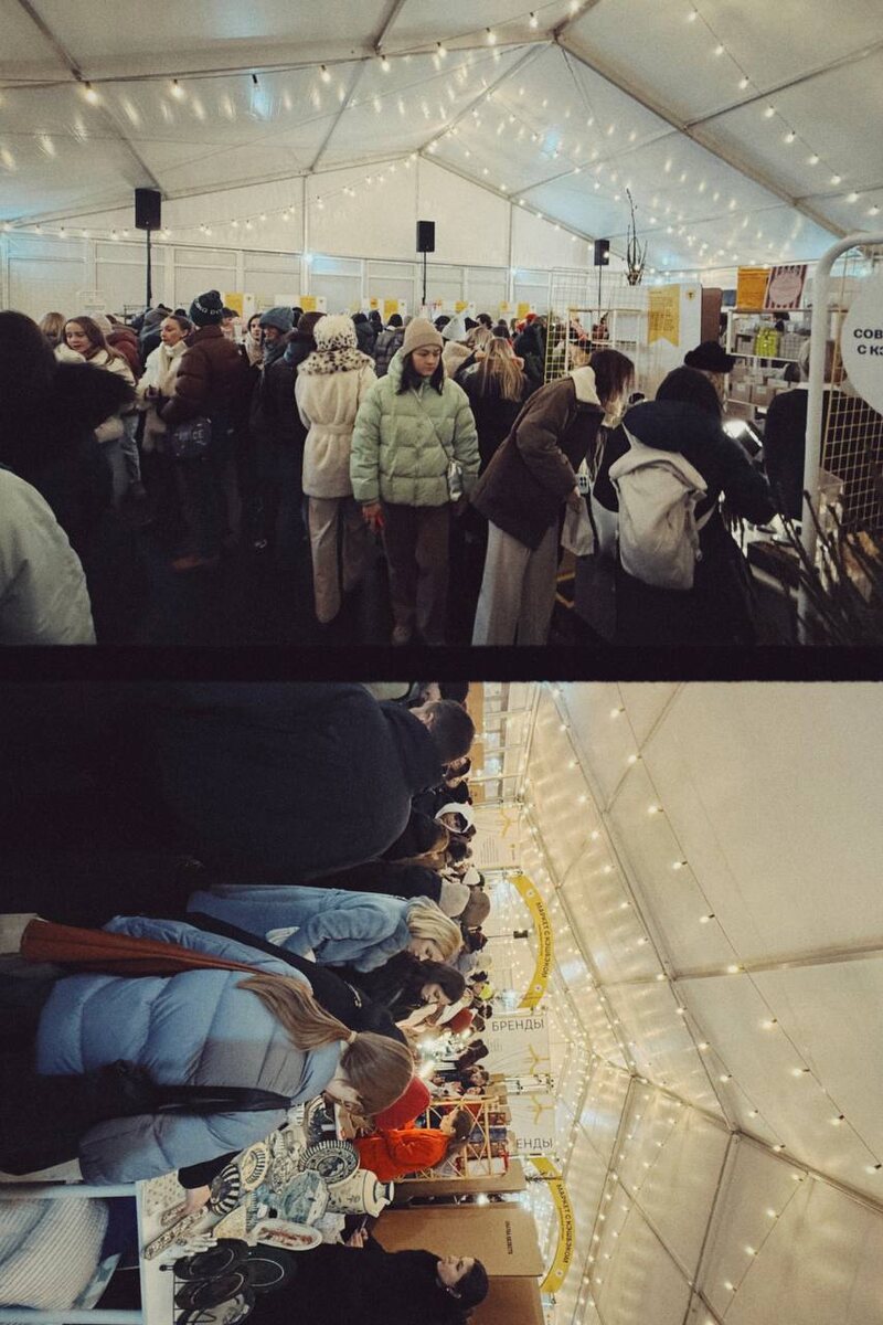 Реальность: 😐✝️ Людей было настолько много, что в какие-то моменты было просто не протолкнуться и что-то нормально рассмотреть. Я была на многих маркетах и вообще очень люблю этот формат: познакомиться с локальными брендами, прикупить подарочки под Новый год, рассмотреть всякие побрякушки. Обычно под такое арендуют большие пространства (Бойлерная, Маяк, Депо; там около 300-400кв.м), здесь же было 2 малюсеньких шатра, в которых столпилось пол Москвы. Буквально была очередь на то, чтоб просто подойти к стенду. Рекламная рассылка была оч большая, а главный партнер был желтый банк. Но что-то прям совсем отстой получился. Отныне только проверенные места для маркетов, а на рябовскую мануфактуру больше не приеду 😳