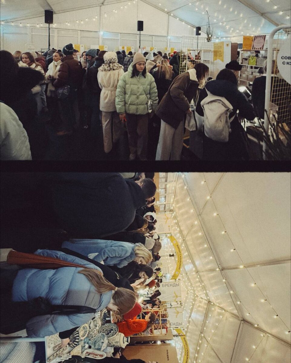 Реальность: 😐✝️ Людей было настолько много, что в какие-то моменты было просто не протолкнуться и что-то нормально рассмотреть. Я была на многих маркетах и вообще очень люблю этот формат: познакомиться с локальными брендами, прикупить подарочки под Новый год, рассмотреть всякие побрякушки. Обычно под такое арендуют большие пространства (Бойлерная, Маяк, Депо; там около 300-400кв.м), здесь же было 2 малюсеньких шатра, в которых столпилось пол Москвы. Буквально была очередь на то, чтоб просто подойти к стенду. Рекламная рассылка была оч большая, а главный партнер был желтый банк. Но что-то прям совсем отстой получился. Отныне только проверенные места для маркетов, а на рябовскую мануфактуру больше не приеду 😳