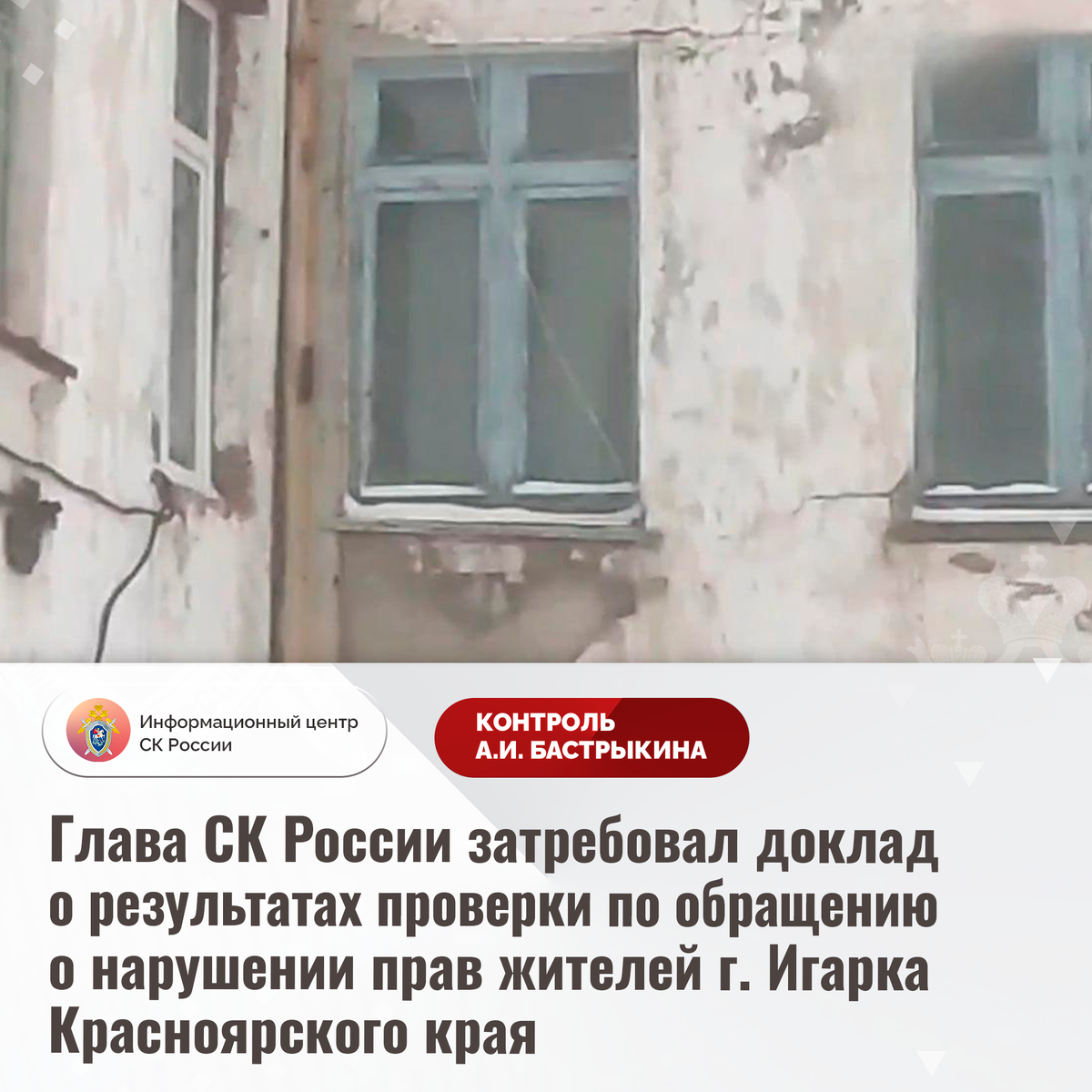 Глава СК России затребовал доклад о результатах проверки по обращению о нарушении прав жителей г. Игарка Красноярского края В комментариях в аккаунте Информационного центра СК России «ВКонтакте» опубликовано обращение жительницы Красноярского края по вопросу ненадлежащего содержания и обслуживания больницы в городе Игарка. На протяжении длительного времени здание единственного в населенном пункте медицинского учреждения, осуществляющего лечение пациентов в стационарных условиях, находится в ветхом состоянии: перекрытия разрушаются, кровля протекает, электропроводка частично не изолирована, штукатурный слой осыпается. Кроме того, больница не оснащена современным оборудованием. Несмотря на имеющиеся нарушения, мер к разрешению проблемы не принимается. Обращения граждан в различные инстанции результатов не принесли. Указанная ситуация освещалась в СМИ и социальной сети. В ГСУ СК России по Красноярскому краю и Республике Хакасии организована процессуальная проверка. Председатель Следстве