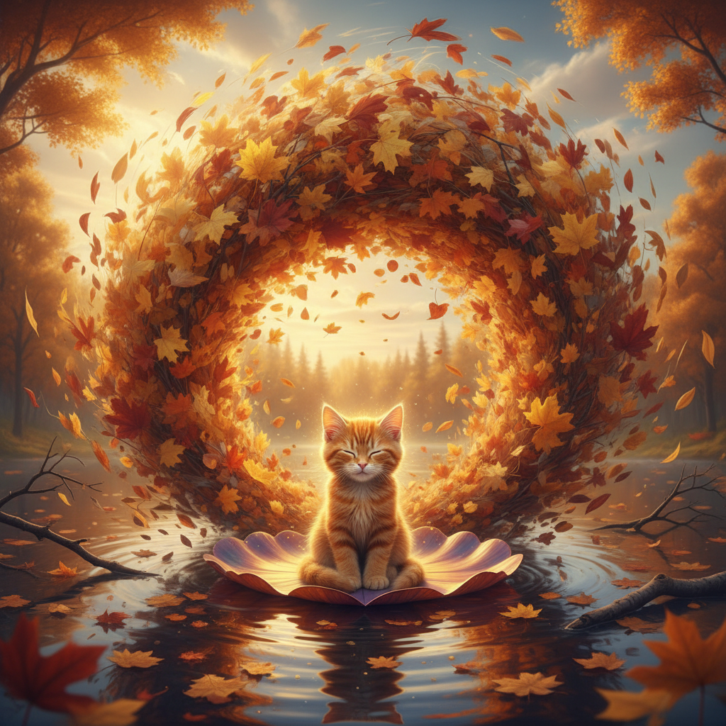 Рыжий котенок Фёдор Котюхов медитирует на водной лилии в эпицентре тайфуна из опавших листьев золотой осени. Red-haired kitten Fedor Kotyukhov meditates on a water lily in the epicenter of a typhoon of fallen leaves of golden autumn.