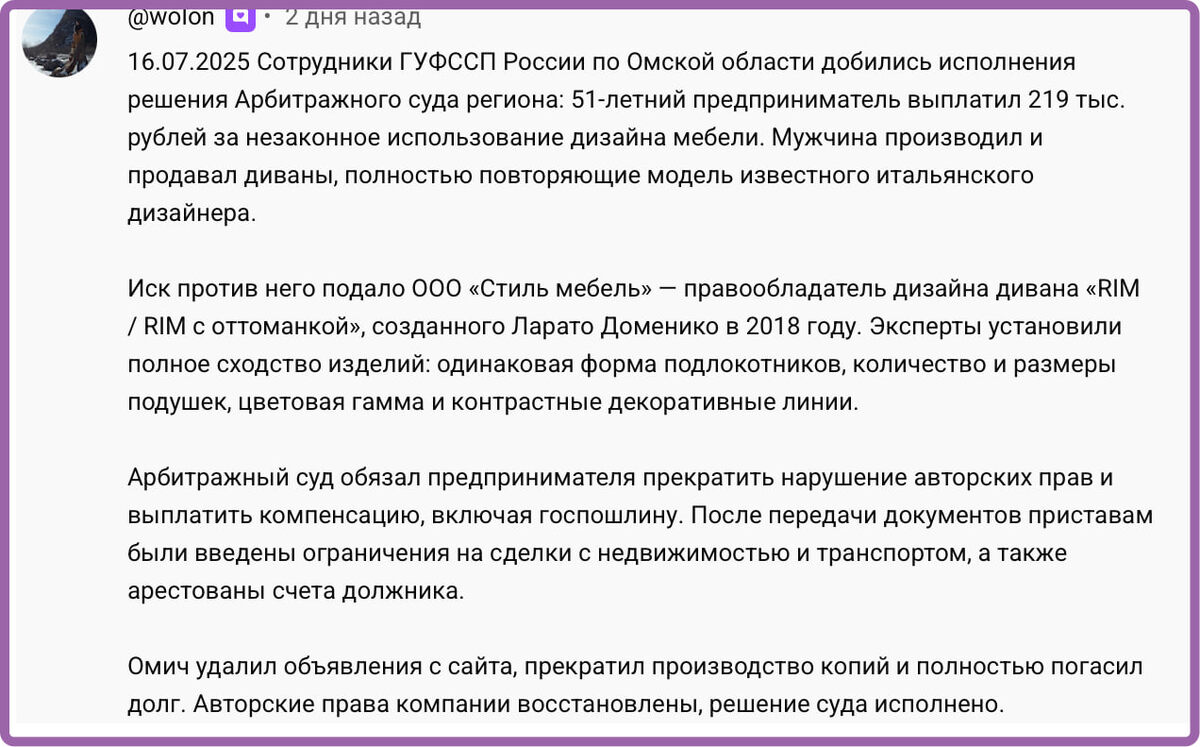 Я вот с авторскими правами не могу понять - толи закон излишне суров, то ли ... Учитывая наш опыт получения претензий (массовых рассылок) я начинаю думать, что в 90% случаев нанятые юристы не защищают владельца прав, а пытаются досудебно заработать... Можно назвать их троллями? :) Закон соблюдать надо, но нет ли в ряде случаев злоупотреблением правом? А на картинке мне пишут - интересно... Мы получали спам по поводу создания реплик известных диванов :) под заказ. Русский ИТ бизнес