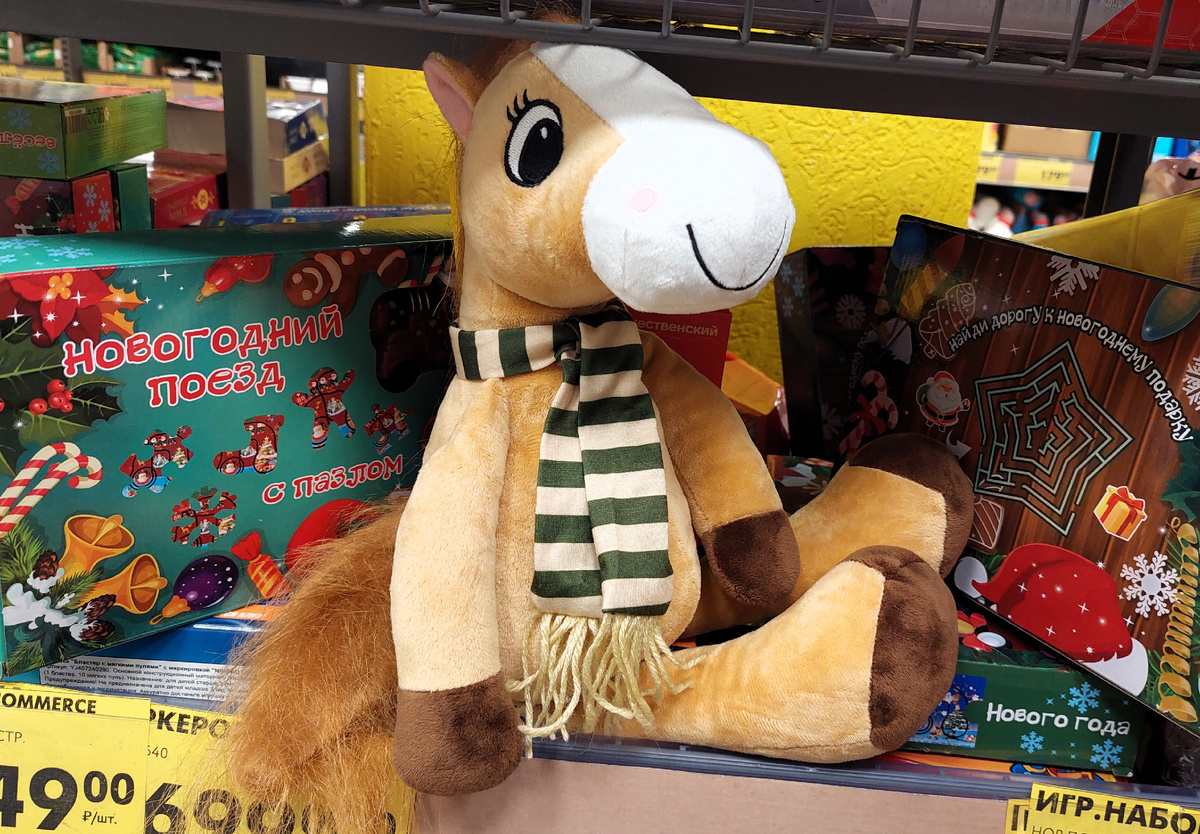 Символ года- симпатичная мягкая игрушка Лошадка, длиной 25 см. Понравились ее выразительные глазки и задорная челка. Цена 399 руб.