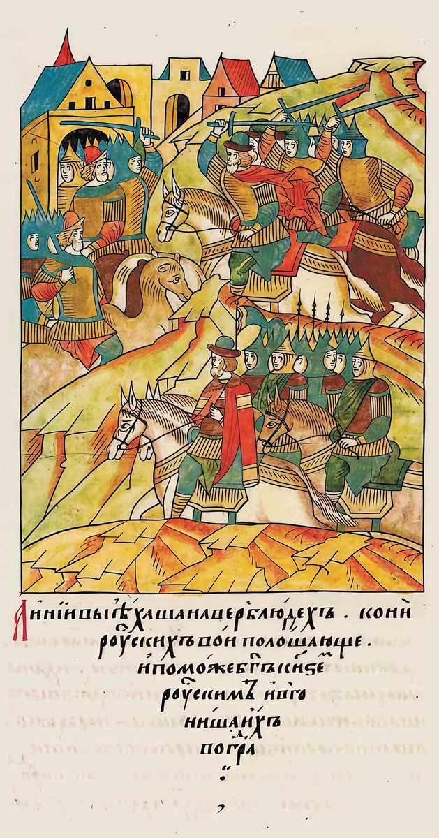 «Булгарский поход русских князей в 1376 году». Миниатюра из Лицевого летописного свода Ивана IV «Грозного». XVI век.