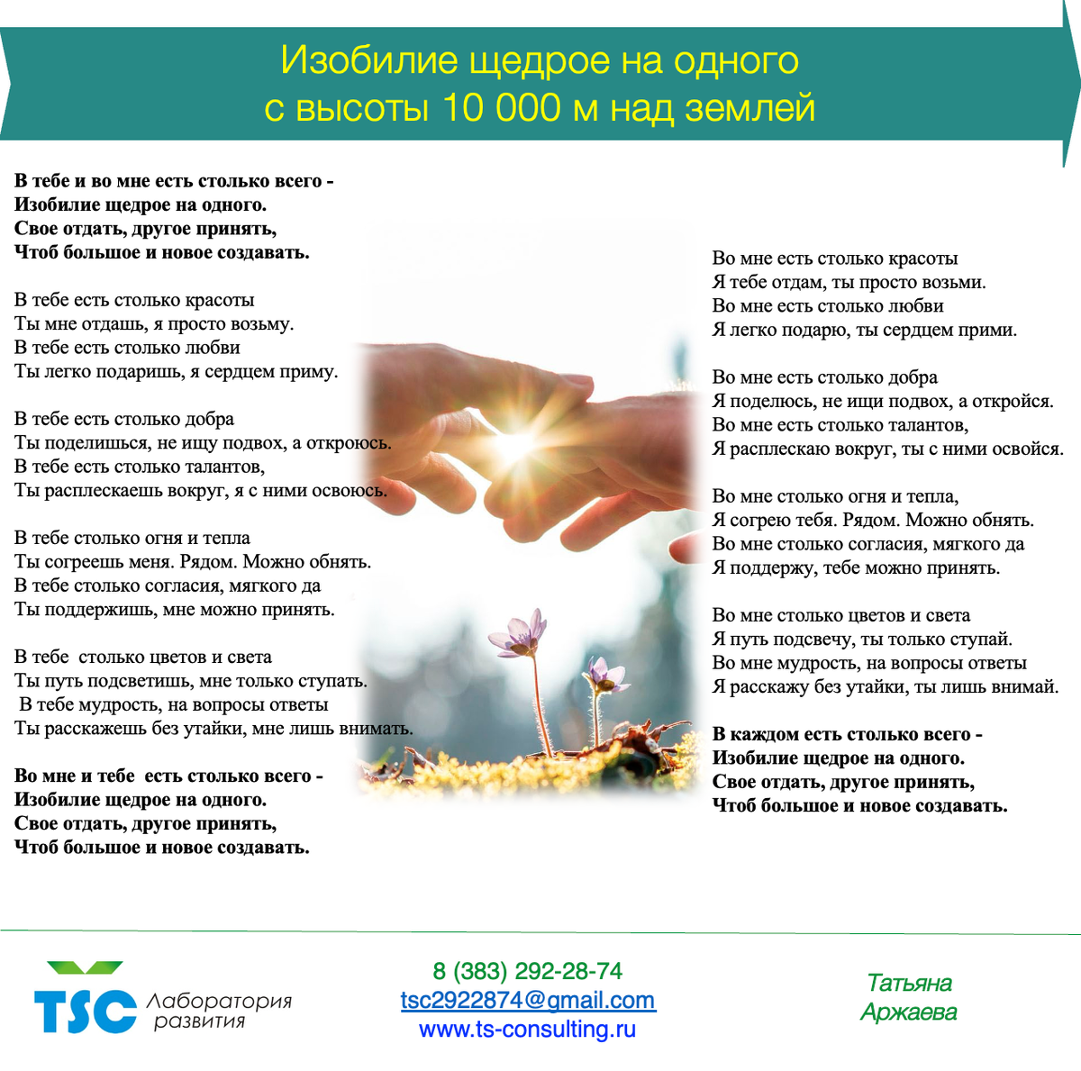 Изобилие щедрое на одного (С высоты 10 000 метров над землей) В тебе и во мне есть столько всего - Изобилие щедрое на одного. Свое отдать, другое принять, Чтоб большое и новое создавать. В тебе есть столько красоты Ты мне отдашь, я просто возьму. В тебе есть столько любви Ты легко подаришь, я сердцем приму. В тебе есть столько добра Ты поделишься, не ищу подвох, а откроюсь. В тебе есть столько талантов, Ты расплескаешь вокруг, я с ними освоюсь. В тебе столько огня и тепла Ты согреешь меня. Рядом. Можно обнять. В тебе столько согласия, мягкого да Ты поддержишь, мне можно принять. В тебе столько цветов и света Ты путь подсветишь, мне только ступать. В тебе мудрость, на вопросы ответы Ты расскажешь без утайки, мне лишь внимать. Во мне и тебе есть столько всего - Изобилие щедрое на одного. Свое отдать, другое принять, Чтоб большое и новое создавать. Во мне есть столько красоты Я тебе отдам, ты просто возьми. Во мне есть столько любви Я легко подарю, ты сердцем прими. Во мне есть столько д