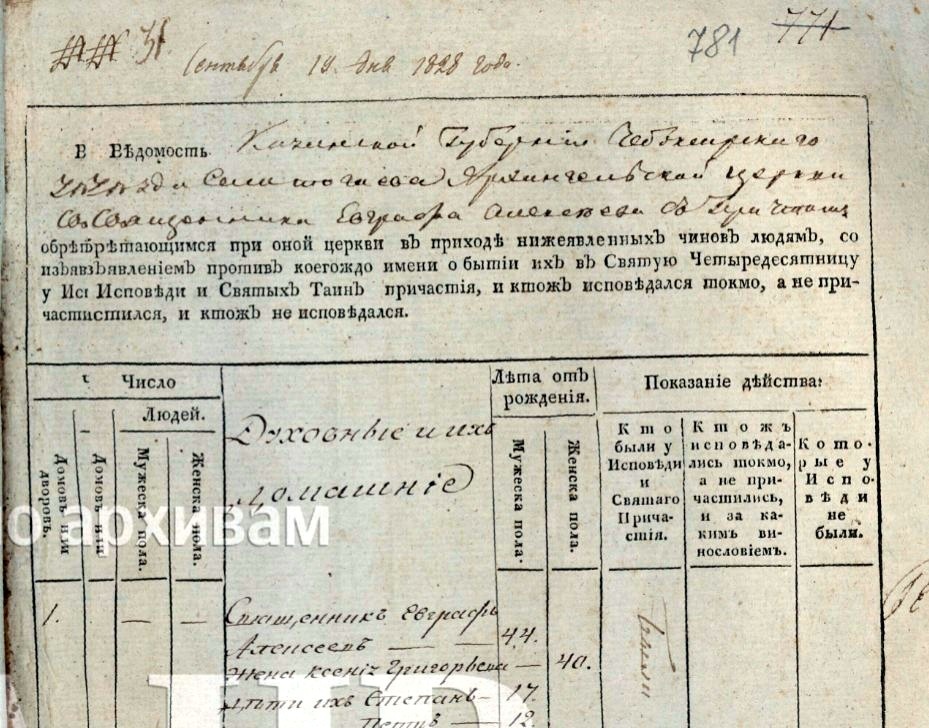 ГИА Чувашской Республики (ГИА ЧР), фонд № 225, опись № 7, дело № 49, стр. 783 скан. Подана сентября 19 дня 1828 года. Ведомость Казанской Губернии Чебоксарского уезда села Тогаева Архангельской церкви священника Евграфа Алексеева с причтом обретающимся при оной церкви в приходе нижеявленных чинов людям, со изъявлением против коегождо имени о бытии их в Святую Четыредесятницу у Исповеди и Святых Таин причастия и кто ж исповедался токмо, а не причастился, и кто ж не исповедался. Духовные и их домашние. № 3. Дьячек Андрей Михайлов. 44. Жена Наталья Борисова. 44. Дети их: Михаил. 19. Иван. 13. Федосья. 15. https://yandex.ru/archive/catalog/3e04ba73-66fd-428d-8243-ce0e7f2228eb/783