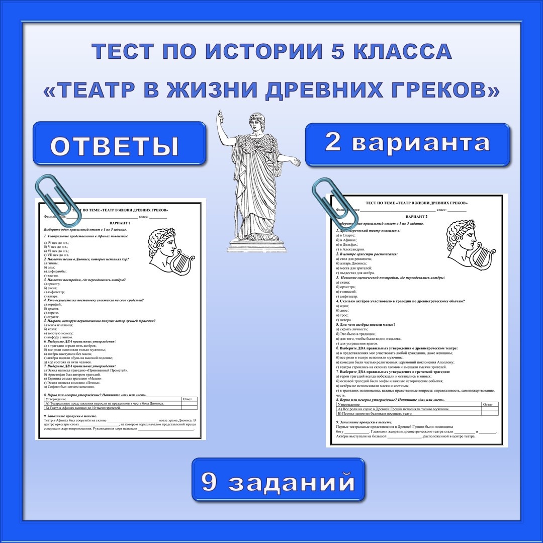 Готовый проверочный тест по истории Древней Греции для 5 класса по теме «Театр в жизни древних греков», составленный по требованиям ФГОС и учебнику В. Р. Мединского, А. О. Чубарьяна «История Древнего мира». Материал идеально подходит для учителей, школьников и родителей. Ключевые особенности теста: Соответствие УМК: Разработан специально для учебника «История Древнего мира» 5 класс под ред. В. Р. Мединского и А. О. Чубарьяна. Структурированное содержание: Полностью охватывает программу по темам «Рождение театра», «Древнегреческая трагедия», «Древнегреческая комедия». Разноуровневые задания: Включает вопросы разных типов для комплексной проверки знаний: