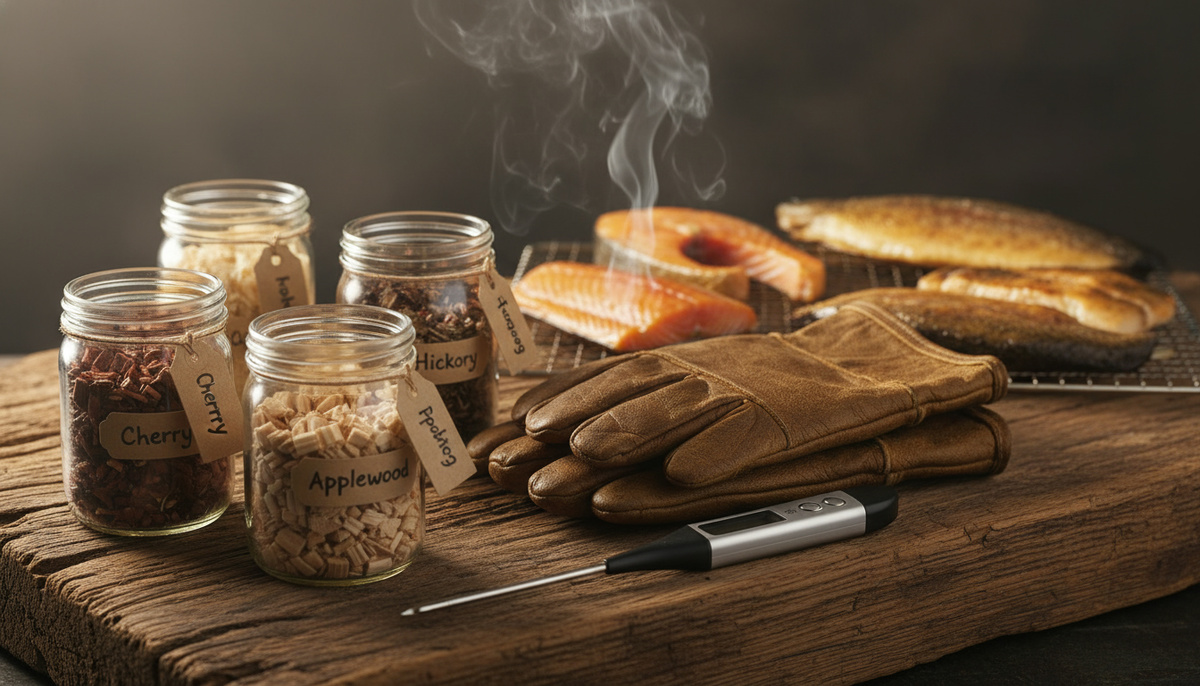 Фото 1 — крупный план набора щепы, перчаток и термометра на состаренной доске; рядом — свежая копчёная рыба, тёплый боковой свет.