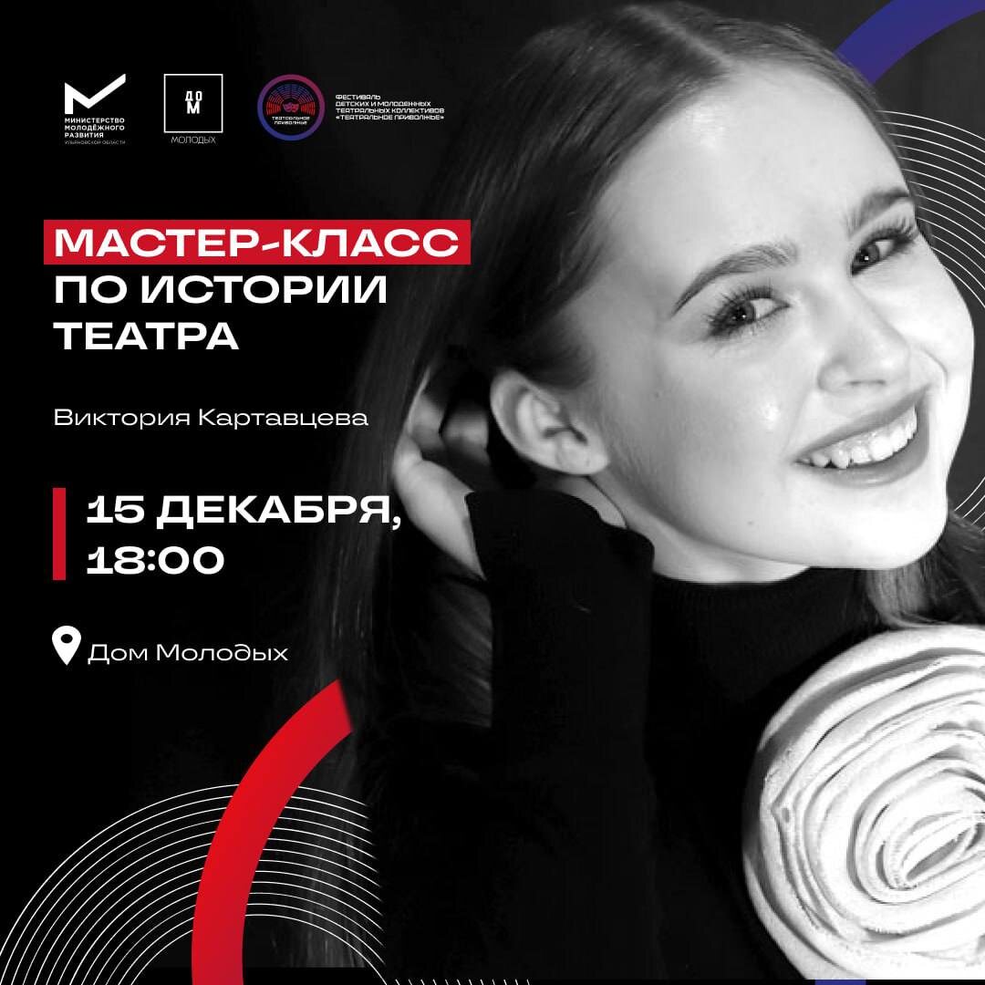Мастер-класс по истории театра с Викторией Картавцевой 🗓️ 15 декабря 18:00 📍Дом молодых Узнаем о зарождении театра, его эволюции, выдающихся драматургах и актерах, а также о различных театральных направлениях и стилях. Этот мастер-класс расширит кругозор и поможет лучше понять современные тенденции в театре. Виктория Картавцева — Лауреат I степени Международного конкурса-фестиваля «Жар-Птица России» в номинации «Театральное искусство», Лауреат Молодежного театрального фестиваля-конкурса «Надежда», ведущая актриса Ульяновского молодежного театра имение Б.В. Александрова. Ссылка на регистрацию: https://clck.ru/3QXFG4 #15декабря25@culturnik