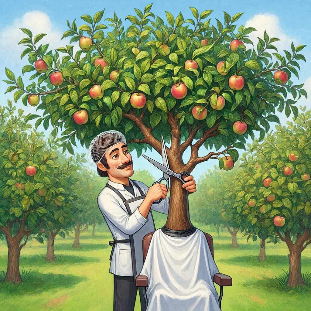 🌳 Чем отличается стрижка от обрезки?✂️ Слово «стрижка» привычно для парикмахеров. В саду его тоже часто используют — "подрезали кончики, выровняли крону". А вот обрезка — это уже работа с будущим дерева. Стрижка в саду, что это? При стрижке внимание направлено на форму: - укоротить ветви - сделать ровно - придать опрятный вид. Дерево выглядит аккуратно сразу после работы — и на этом задача выполнена. Профессиональная обрезка. Она начинается с понимания дерева. Специалист агроном при обрезке растений: - различает плодовые и ростовые почки - знает, где закладывается урожай - оставляет ветви, которые дают плоды - убирает те, что забирают питание - очищает крону от больных и ослабленных веток - формирует направление роста. В результате: - крона светлая и проветриваемая - ветви расположены правильно - дерево растёт гармонично. Что это будет значить для садовода. Профессиональная обрезка даёт: - стабильный и качественный урожай - оптимальную высоту и ширину дерева - сбор плодов без л