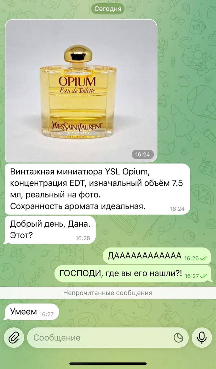 Помните пост про магазин винтажных штук всяких, включая парфюмы? Я просила найти мне оригиналы снятых с производства первых флаконов духов - один из которых тот самый Опиум! Которым я однажды побрызгала куклу. Примерно половиной флакона. Нашли!!!! https://t.me/nekenga39 - это же чудо!!! Всё, едет ко мне флакончик! 🔥