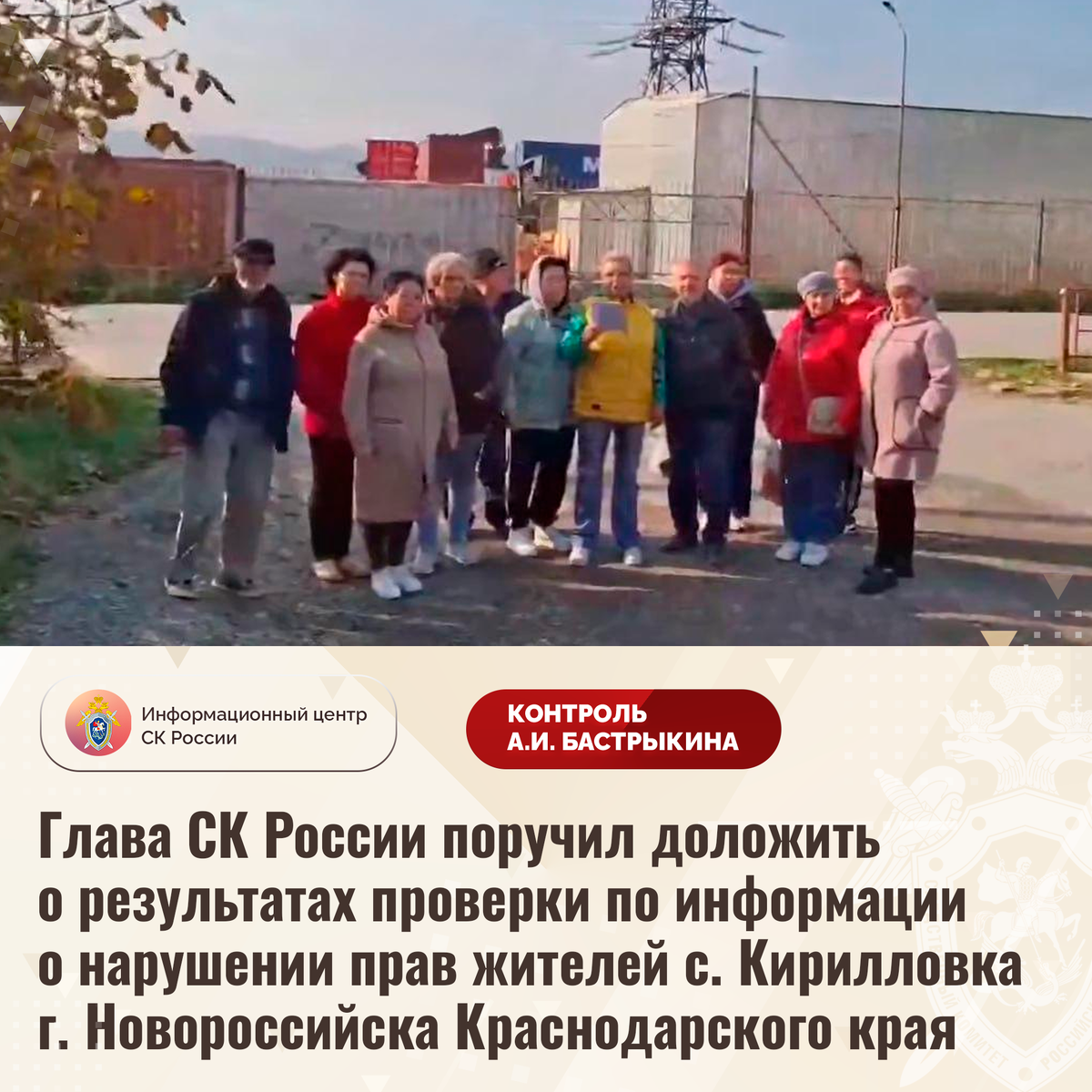 Глава СК России поручил доложить о результатах проверки по информации о нарушении прав жителей с. Кирилловка г. Новороссийска Краснодарского края В сети Интернет размещено видеообращение жителей села Кирилловка города Новороссийска Краснодарского края по вопросу нарушения их прав. Предпринимателем на территории охранной зоны линий электропередачи и в непосредственной близости к частному сектору возведен зерновой терминал. В результате деятельности организации нарушается режим тишины, а также в атмосферу выбрасываются вредные вещества, от которых у граждан может ухудшиться состояние здоровья. Многочисленные обращения в компетентные органы результатов не принесли. В СУ СК России по Краснодарскому краю по данному факту организована процессуальная проверка. Председатель Следственного комитета Российской Федерации Александр Иванович Бастрыкин поручил руководителю СУ СК России по Краснодарскому краю Андрею Константиновичу Маслову доложить о предварительных и окончательных результатах проце