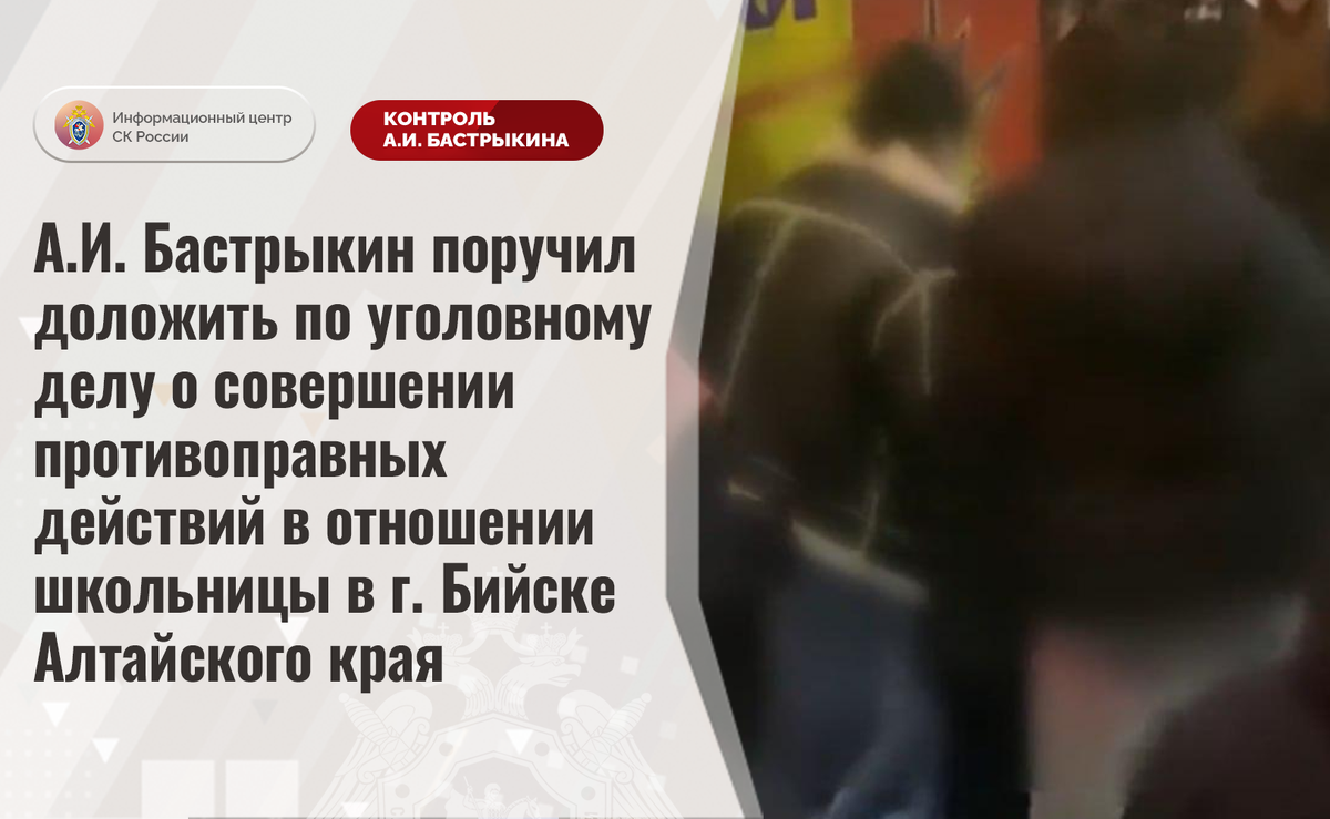 А.И. Бастрыкин поручил доложить по уголовному делу о совершении противоправных действий в отношении школьницы в г. Бийске Алтайского края В СМИ и социальной сети сообщается, что 11 декабря текущего года в городе Бийске Алтайского края две девочки избили 14-летнюю школьницу. Противоправные действия несовершеннолетних зафиксированы очевидцами на видео. В СУ СК России по Алтайскому краю по данному факту возбуждено уголовное дело. Председатель Следственного комитета Российской Федерации Александр Иванович Бастрыкин поручил и.о. руководителя СУ СК России по Алтайскому краю Виталию Александровичу Поливанову представить доклад об установленных в ходе первоначальных следственных действий обстоятельствах, а по завершении расследования – о его результатах. Исполнение поручения поставлено на контроль в центральном аппарате ведомства. #СледственныйКомитет #СКРоссии #СКР #ИЦСКР #ИнформационныйЦентр #АлександрБастрыкин #ПредседательСКР #КонтрольПредседателяСКР #КомментарийКонтроль #АлтайскийКрай