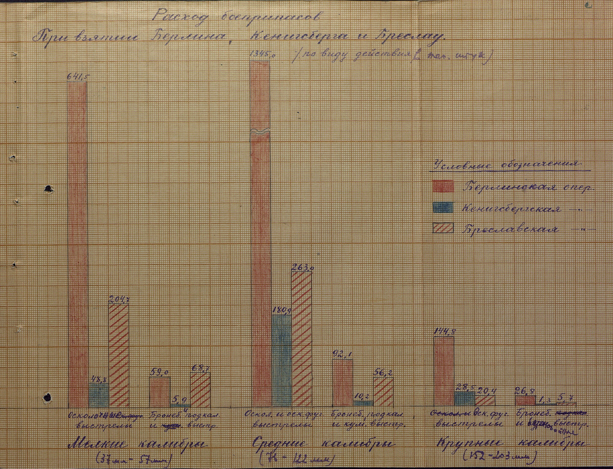Первая диаграмма взята из документа с длинным названием "Доклад по исследованию расхода боеприпасов по видам действий в целях использования опыта Отечественной войны при планировании заказов промышленности по боеприпасам" и представляет итоговые данные по расходу в трёх операциях: взятие Берлина, Кенигсберга и Бреслау: