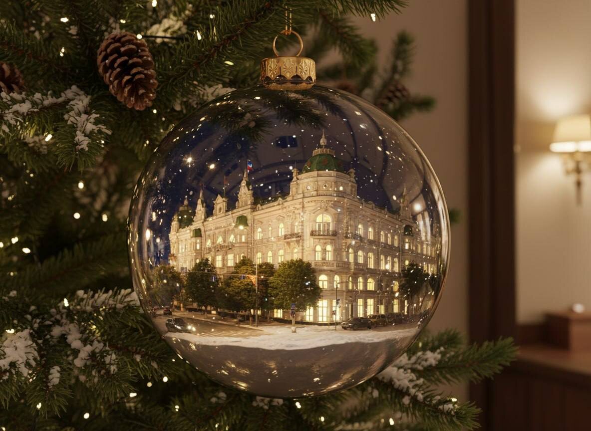🔮Город поместился в одном стеклянном шаре и теперь тихо светится на пушистой еловой ветке