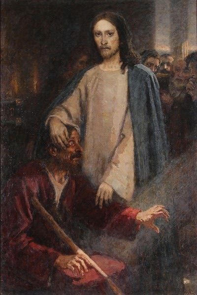«Иисусе, Сыне Божий, помилуй мя». Больной не просит Христа об исцелении, а говорит «помилуй», зная, что Бог — Милосердный. Человек по грехам своим не заслужил исцеления, но по милости Божией обращается к Нему с просьбой. Где милосердие сегодня? — Распространение Евангелия, жизнь по Евангелию — милосердие к миру. Улыбка, доброе лицо — милосердие к человеку. Христиане должны одной рукой дать стакан воды, другой — указать на Христа. Милосердная рука любви, которой надо пользоваться постоянно. У многих христиан рука бездействует: вывихнута, ампутирована, засохла. «Нельзя же вам помогать», — говорим мы. Но надо протягивать свою руку к Богу за даром Святого Духа — и тогда появится милосердие. Милосердие делает человека блаженным. Господь милосерд и сострадателен, и, приняв Его, человек чувствует важность милосердия. Архимандрит Елеазар (Иванов) #АрхимандритЕлеазарИванов "Исцеление слепорожденного Иисусом Христом", Василий Суриков, 1888 г.