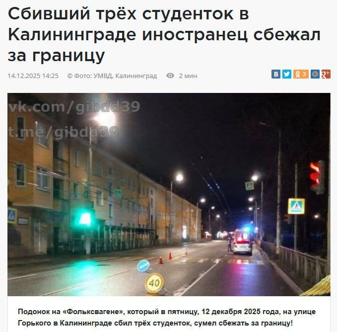 👹 Мигрант-таксист сбил пешеходов и сбежал из России. 12 декабря в центре Калининграда неадекватный водитель ночью на красный свет влетел в трёх местных студенток, переходивших дорогу по зебре. Одна из девушек получила тяжёлые травмы и сейчас находится в реанимации. «Ценный специалист», конечно же, не стал дожидаться полиции и сразу скрылся с места происшествия. Личность преступника была выявлена по автомобильным знакам, которые остались лежать на месте наезда. Водитель был, очевидно, трезв, просто мчал на большой скорости, после остановки он вышел из машины, а потом объехал лежавшие тела и понёсся дальше. После ДТП он сразу же покинул территорию страны. Пикантности ситуации добавляет то, что мигрант трудился таксистом, что фактически нелегально с 2024 года на территории Калининградской области согласно указу губернатора. Теперь владельца машины, сдавшего её иностранцу, оштрафуют. А самого преступника объявили в международный розыск... Но найдут ли? 👉 #Высокий_Спрос. Подписаться