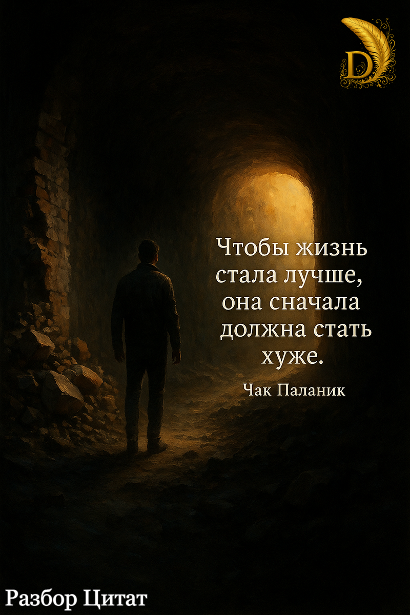 Цитата: ✨ «Чтобы жизнь стала лучше, она сначала должна стать хуже.» — Чак Паланик 🔹 О чём эта цитата? О честной стороне перемен. О том, что развитие почти всегда начинается с дискомфорта: рушатся привычные опоры, исчезает чувство стабильности, появляется страх. Это не сбой системы, а её работа 🔄. Цитата говорит о переходном моменте, когда старое уже не работает, а новое ещё не оформилось. 🔹 Почему это важно? Потому что в сложные периоды мы часто думаем, что идём не туда 😣. Эта мысль помогает переосмыслить боль и кризис: не как поражение, а как этап. Она учит не торопиться с выводами и не обесценивать путь только потому, что он оказался трудным. 🔹 Почему и для кого актуальна? Для всех, кто сейчас стоит на перепутье: меняет работу, отношения, взгляды на жизнь или самого себя 🧭. Для тех, кто чувствует, что стало «хуже», но не понимает — зачем. Эта цитата особенно близка тем, кто растёт, даже если рост пока ощущается как падение 💭✨. 🧭 Толкование Цитата говорит о простой, но непри