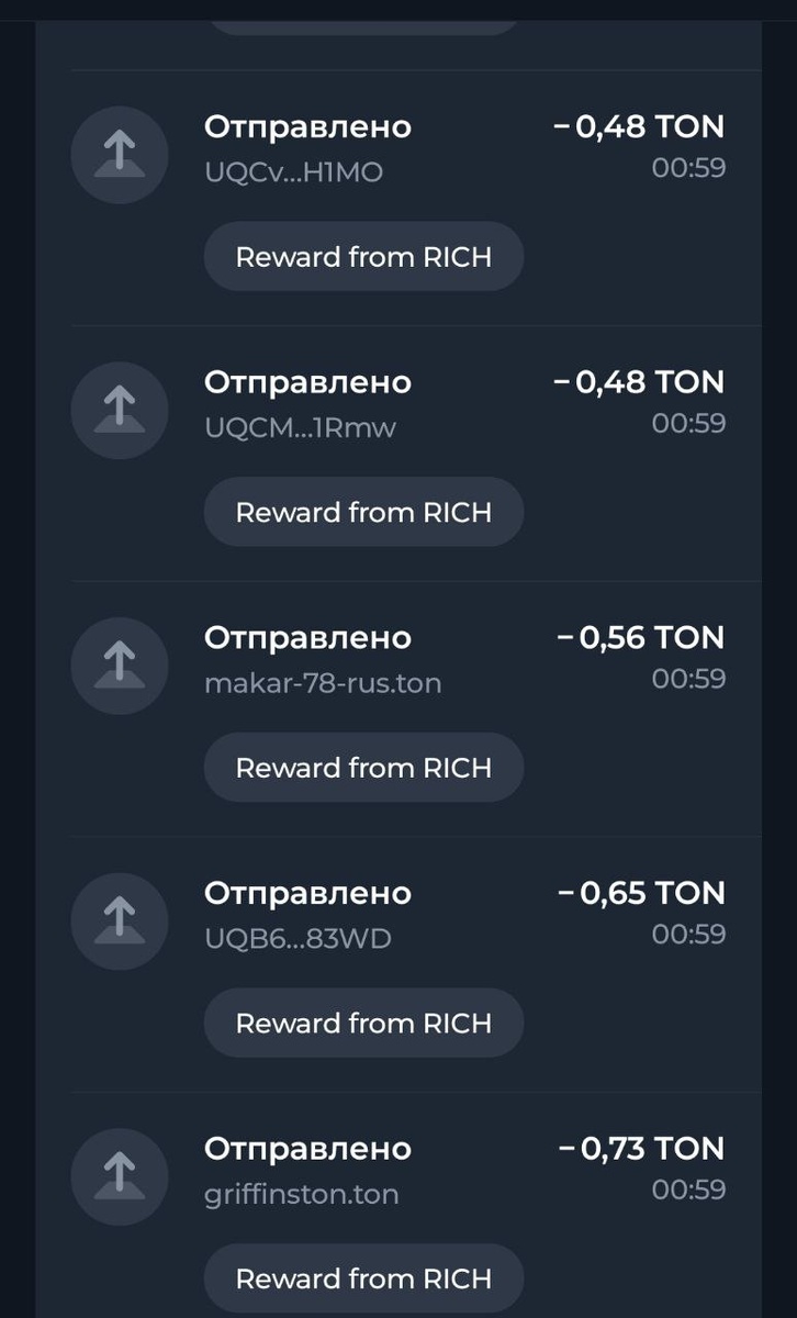 Привет Ричмэны. Сегодня 15 число. Дивиденды отправлены в размере 12.43 TON Работаем дальше и не забываем, что сейчас у вас есть возможность купить NFT RICH ON TON выгодно 3 по цене 2. Не является индивидуальной инвестиционной рекомендацией. | КАНАЛ | ЧАТ | Rikki Rich | RICH on TON | САЙТ | ROADMAP | ---------------------VNUK---------------------- | Канал | Чат | Sticker | Dedust | График | САЙТ | ROADMAP | наш бот | DYOR | mr.Vnukich |