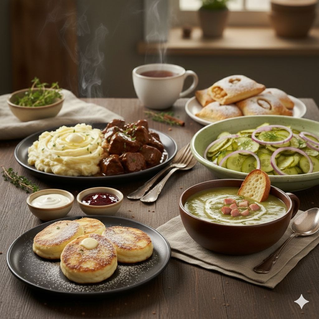 ☀️ Меню дня — вкусно, по-домашнему и с настроением 🍽️ Когда еда простая, но сделана с любовью — день сразу складывается удачно. 🍳 Завтрак: 🧀 Сырники со сметаной или ароматным джемом 🍲 Обед (первое блюдо): 🌿 Гороховый суп с копчёностями — сытный и согревающий 🍖 Ужин (основное блюдо): 🥩 Тушёная говядина с нежным картофельным пюре 🥗 Салат к ужину: 🥒 Салат из солёных огурцов с луком — простой и очень вкусный 🍎 Десерт / выпечка: 🥐 Слойки с яблоками — хрустящие, ароматные, к чаю ✨ Сохраняйте меню, чтобы не ломать голову, что приготовить, и заходите за новыми идеями каждый день А теперь подробнее про Сырники со сметаной или ароматным джемом Идеальны на завтрак или к чашке чая. 🛒 Ингредиенты: • 500 г творога (лучше 5–9%) • 1 шт яйцо • 2–3 ст. л. сахара • 1 пакетик ванильного сахара • 3–4 ст. л. муки + немного для обваливания • 1 щепотка соли • растительное масло — для жарки 👩🍳 Приготовление: 1️⃣ Творог переложите в миску, при необходимости разомните вилкой или пробейте блендер