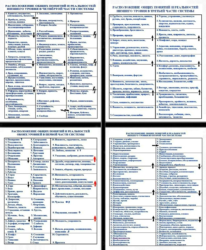 2. Противоположности между слаборазвитыми реальностями из второй и из четвёртой частями системы языка. Самые слабо развитые общие понятия всех групп из начальных подуровней второй части системы противоположны общим понятиям всех групп, расположенным в правом ряду четвёртой части системы. Самые развитые общие понятия во всех группах из последних подуровней второй части системы языка противоположны общим понятиям во всех группах, расположенных в левом ряду четвёртой части системы языка. Это потому, что общие реальности левого ряда в четвёртой части системы более развиты, чем общие реальности правого ряда. Развитие слаборазвитых общих реальностей в четвёртой части системы идёт в направлении от правого ряда к левому ряду.