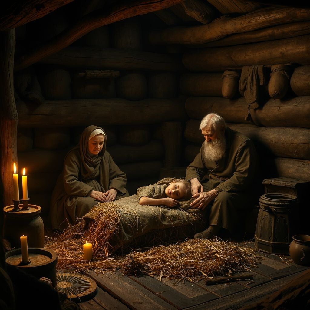 Когда Марья и Еремей нашли сына, он был ещё жив, но едва подавал признаки сознания. Они донесли его до дома, надеясь, что недуг отступит сам собой. Но к ночи мальчик лежал неподвижно, словно выгорая изнутри.