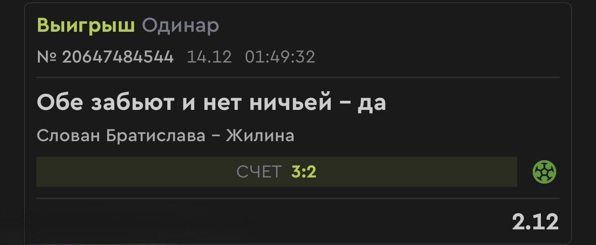 В ответ на пост Был лютый тренд на голы: ✅ Слован забивал Жилине в 10 из 11 последних личных встреч. Жилина забивает в 15 из 16 последних матчей вообще ✅ Сумасшедшая атака обоих команд: в сезоне в среднем забивают более 2 голов за игру (2.1 и 2.4 соответственно). При этом Слован дома, а Жилина в гостях регулярно пропускают ✅ Последние 11 матчей Слована и 9 из 10 матчей Жилина НЕ заканчивались ничьей. В личных встречах тоже преобладают победы одной из сторон 😈 ✅ Обе в топе чемпионата, у Жилины отставание в два очка. Проигрывать нельзя. У Слована дома 6 побед в 8 матчах, но Жилина выиграла в 7 из 10 последних туров Статистика, форма и мотивация отвергали скучную ничью и гарантировали обмен голами. Коэффициент 2.12 за такой исход выглядел более чем щедрым при таком раскладе! Так и произошло , 3-0 уже к 53 минуте , далее на 58 гости забили 3-1 и на 89 уже 3-2 😆 Затем 5 минут валидола, но на этот раз все путём 🤑Поздравляю с заходом , всех кто забрал матч! Завтра продолжим ! 🥳 (есл