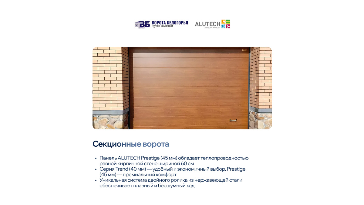 Зимой каждый выезд из гаража может стать настоящим испытанием: выйти из тёплого автомобиля и вручную открыть ворота — неудобно и холодно. Решение есть: автоматические секционные и роллетные ворота ALUTECH обеспечивают комфорт, безопасность и простоту использования. Ворота оснащены стандартными системами защиты от препятствий и случайного повреждения автомобиля или людей. Управление через приложение позволяет следить за состоянием ворот из любой точки и настраивать индивидуальные сценарии работы. С автоматическими воротами ALUTECH зимний холод и неудобства перестанут быть проблемой. «Ворота Белогорья» подберут и установят систему, идеально подходящую для вашего гаража. Комфорт, безопасность и стиль — одно нажатие, и ворота открыты!