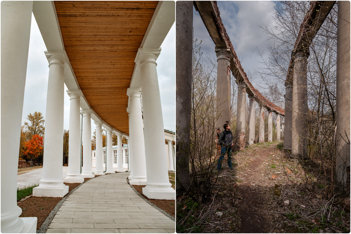 В усадьбе Горки состоялось открытие обновленной колоннады, соединяющей усадебный дом с павильоном. Долгие годы она находилась в разрушенном состоянии, смотрите на архивные фотографии, сделанные в разные годы.