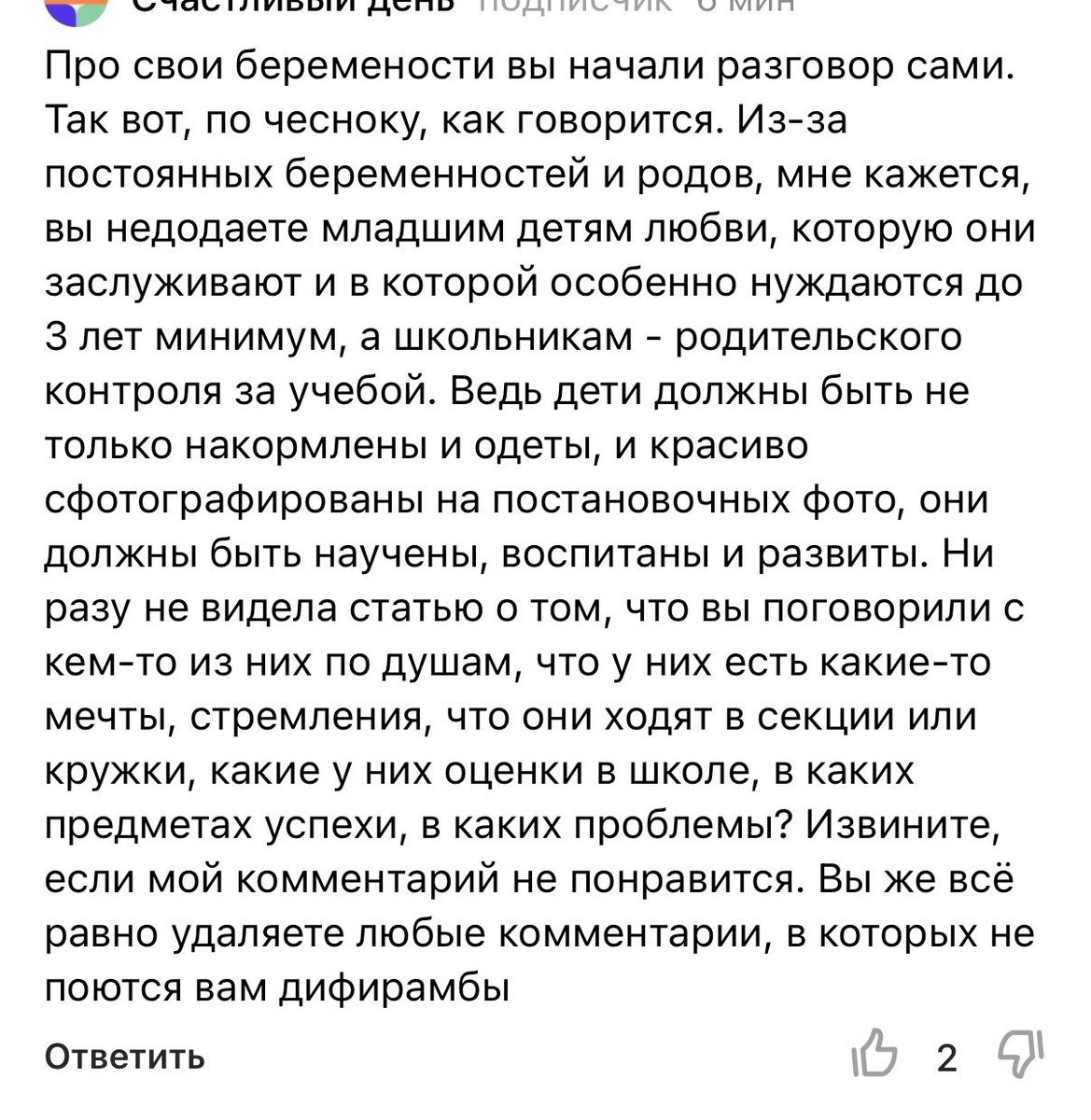 Про свои беременности вы начали разговор сами. Так вот, по чесноку, как говорится. Из-за постоянных беременностей и родов, мне кажется, вы недодаете младшим детям любви, которую они заслуживают и в которой особенно нуждаются до 3 лет минимум, а школьникам — родительского контроля за учебой. Ведь дети должны быть не только накормлены и одеты, и красиво сфотографированы на постановочных фото, они должны быть научены, воспитаны и развиты. Ни разу не видела статью о том, что вы поговорили с кем-то из них по душам, что у них есть какие-то мечты, стремления, что они ходят в секции или кружки, какие у них оценки в школе, в каких предметах успехи, в каких проблемы? Извините, если мой комментарий не понравится. Вы же всё равно удаляете любые комментарии, в которых не поются вам дифирамбы.