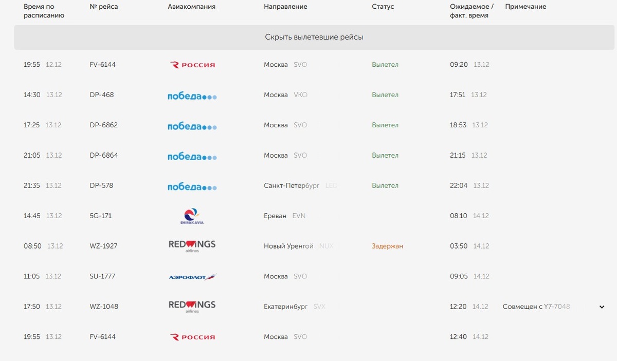 Однако некоторые авиакомпании перенесли рейсы на следующий день. Больше всего повезло пассажирам авиакомпании «Победа». Максимальная задержка рейса составила 3 с небольшим часа. Остальные рейсы «Победы» улетели почти вовремя. А вот рейс «Аэрофлота» задержался на 22 часа, рейс «России» вылетел с задержкой на 17 часов, рейс Shirak avia в Ереван — 17,5 часов, рейс RedWings в Новый Уренгой — на 21 час, в Екатеринбург — на 22,5 часа.