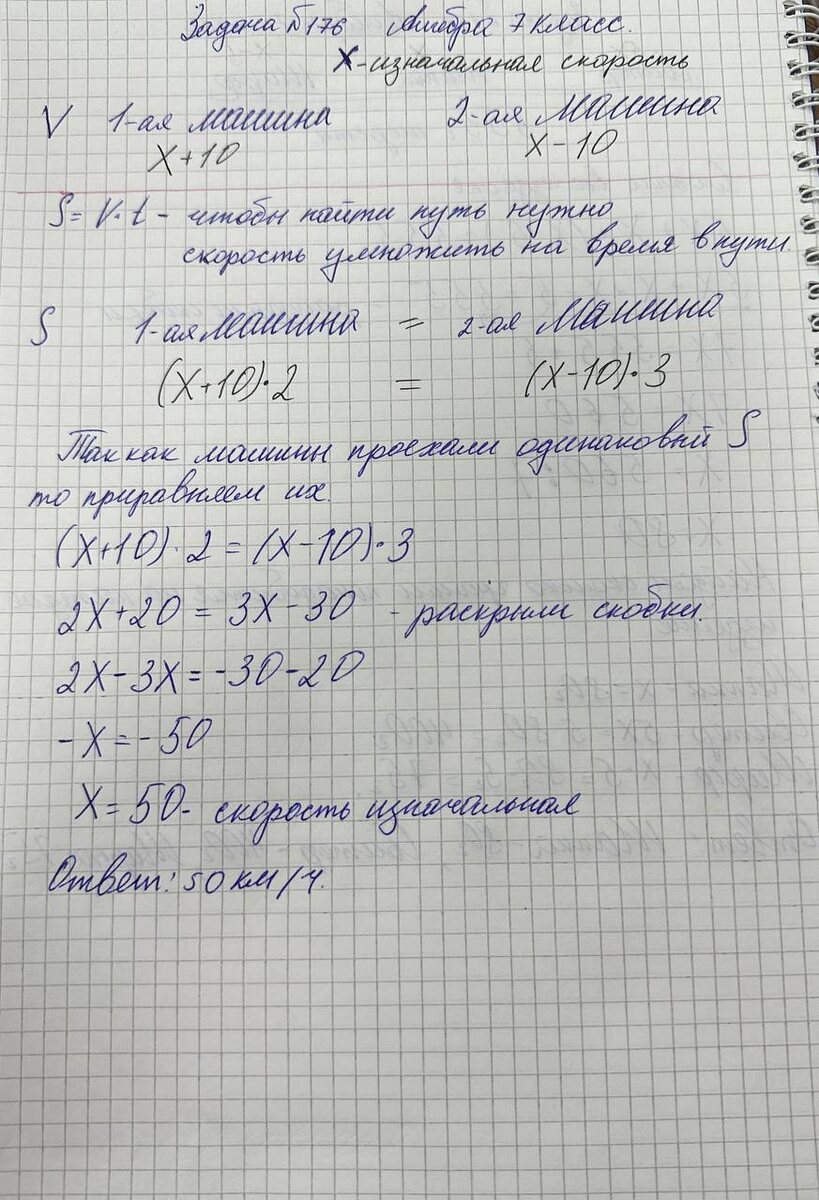 Путь(S), который проехали машины: 1- ая машина (X+10)• 2 = 2-ая Машина (X-10)• 3 Так как машины проехали одинаковый то приравняем их пути(S) (X + 10)*2 = (X-10)*3 2X + 20 = 3X - 30 - раскрыли скобки. 2X - 3X = -30 -20 - X = -50 надо найти сам Х поэтому умножим обе части уравнений X= 50 - скорость изначальная Ответ: 50 км/ч