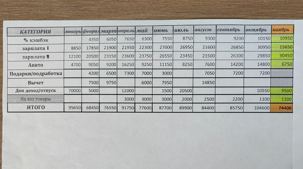 Всем Добрый день! Сегодня покажу вам итоговые таблицы по накопления и тратам, которые веду с момента внедрения метода конвертов в свой семейный бюджет. В Ноябре у меня было четыре распределения. Распределяла наши с мужем зарплаты, аванс, часть отпускных, доход от подработки и от продаж на авито. Общая сумма на распределениях в Ноябре – 74.400 рублей. Общая сумма на распределения с начала года – 936.750 рублей. Распределяю деньги на два бюджетника: 53% в накопительный и 47% в расходно накопительный. В накопительный органайзер за Ноябрь месяц было распределено – 39.350 руб. Траты были в трех конвертах. Налоги – 12000руб – обнулила конверт, т.к. оплатила налоги за год Машина 2000руб – оплатила штрафы (еще и не хватило)) Новый год 20000руб – почти всем купила подарки к новогодним праздникам. Итого траты в накоплениях – 34.000 руб. Общая сумма денег в накопительном органайзере – 237.600 руб. В расходно - накопительный органайзер за Ноябрь месяц было распределено – 35.050 руб. Траты в это