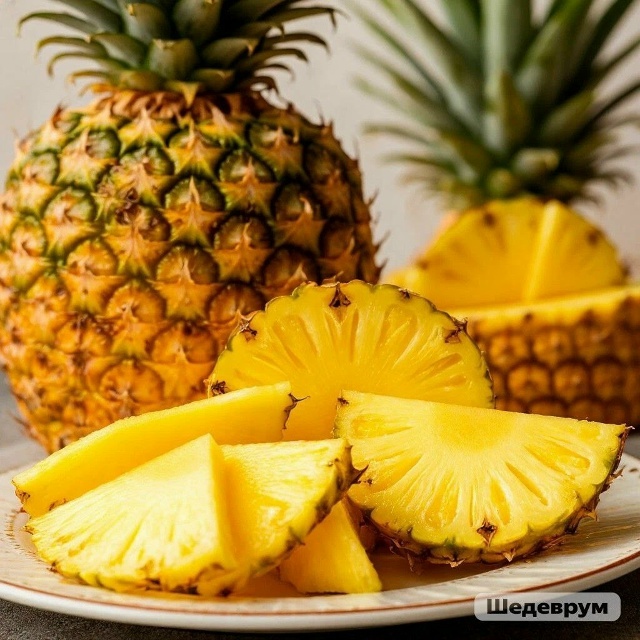 Ананас — это тропический фрукт, состоящий на 85% из воды и на 15% – из простых сахаров: фруктозы и сахарозы. Он знаменит тем, что содержит фермент бромелаин, который улучшает пищеварение. Также в нём есть витамины — бета-каротин, В1, В2, В6, PP; микроэлементы — кальций, магний, цинк, йод; клетчатка; органические кислоты — аскорбиновая и лимонная. Мякоть свежих плодов низкокалорийна – 50 ккал в 100 г. ВАЖНО!
