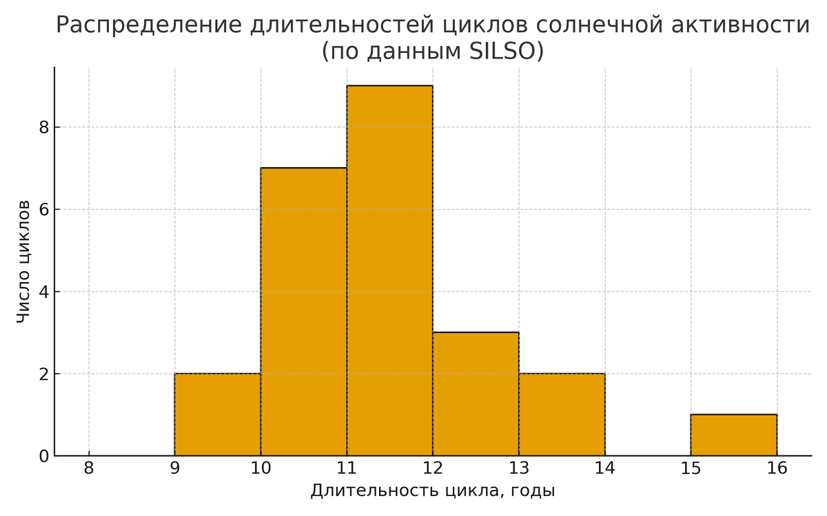 Циклы Солнца не привязаны к одной единственной цифре. На гистограмме ясно видно, что реальная длительность колеблется в широком диапазоне — примерно от 9 до 15 лет. Встречаются циклы длиной 9–10 лет, есть циклы 12–13 лет и даже длиннее. Никакого жёсткого 11-летнего метронома в природе не существует.