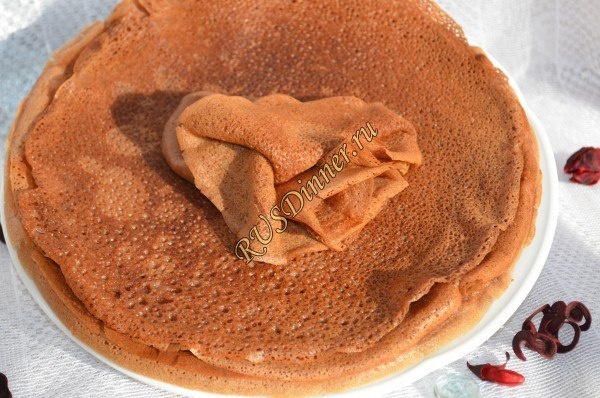 Шоколадные блины Ингредиенты: Шоколад темный - 50 гр. Какао порошок - 15 гр. (1 ст. л.) Яйцо - 2 шт. Молоко - 400 мл. Вода - 150 мл. Мука - 160 гр. Сахар - 50 гр. (2 ст. л.) Соль - 1 гр. (щепотка) Масло растительное - 50 мл. Источник: https://rusdinner.ru/page/shokoladnye-bliny