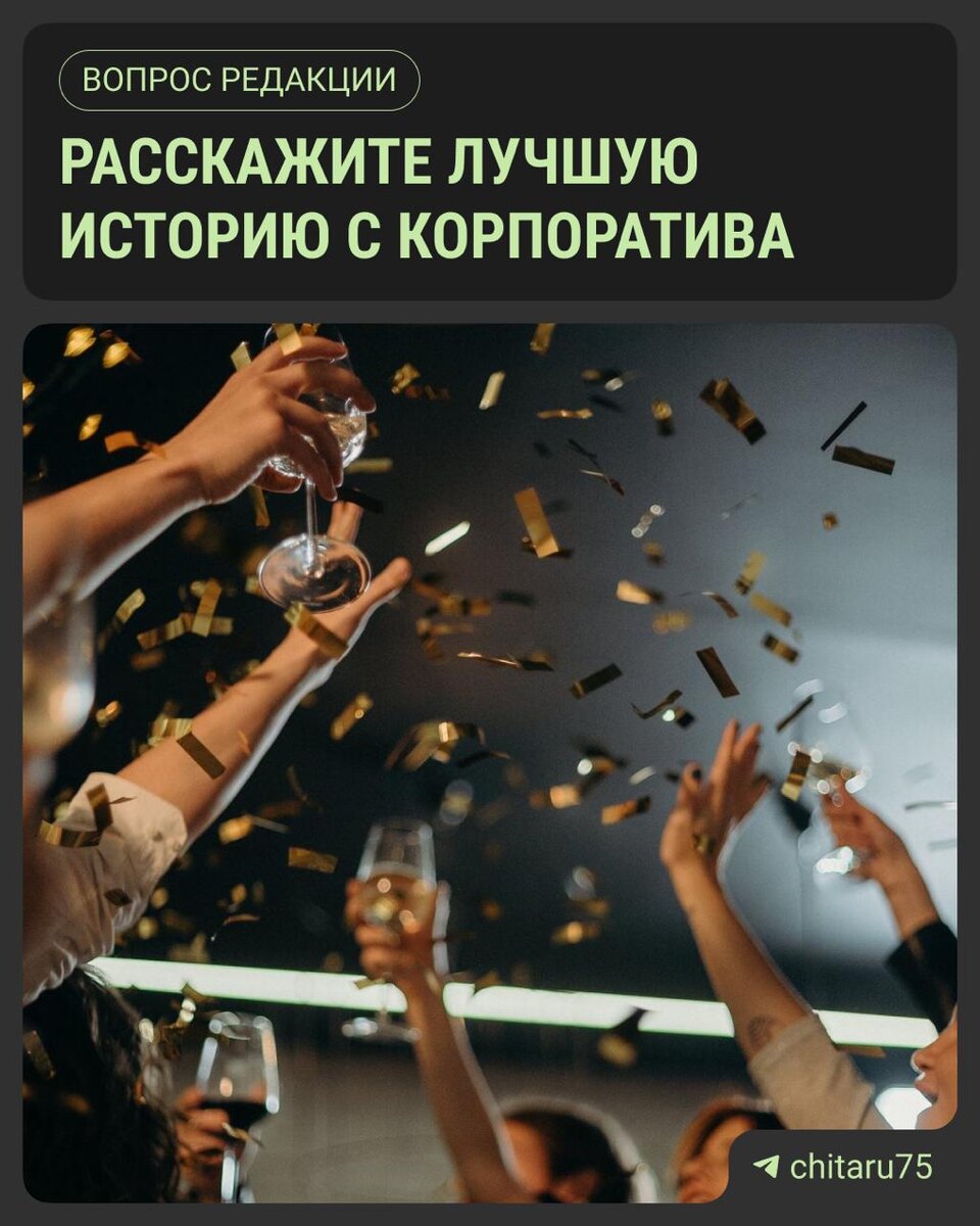 Уже скоро сотрудники читинских офисов и компаний начнут готовиться к новогодним корпоративам. Кто-то соберется в банкетных залах, некоторые выбрали активные зимние прогулки, а есть и те, кто захотят отметить Новый год в тёплой уютной компании прямо в офисе. А помните ли вы свой лучший корпоратив: чем он отличился, или, быть может, с вами произошла какая-то чудесная история. @chita.ru готовит сборку необычных, волшебных историй, которые произошли с забайкальцами на корпоративах. Этими историями вы можете поделиться с нами. Рассказать свою историю и прислать фото можно в телеграм @daryaanuchina.