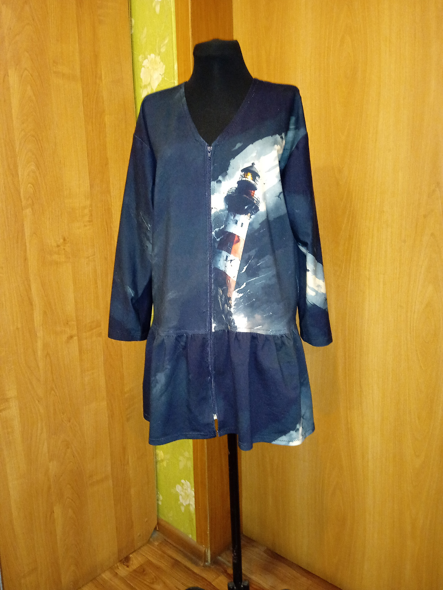 Сегодня сшила халат из лоскута футера. Куски ткани были от 30 до 50 см. длиной при полной ширине 190 см. Один кусок с ярким рисунком, который был напечатан на краю. Поэтому решила шить халат на молнии, чтобы рисунок использовать по максимуму. Раскроила халат, рукав пришлось кроить поперек полотна. Сначала обработала плечевые срезы. Вшила рукав в открытую пройму. Боковые швы и рукав шила сразу одной строчкой. Можно было оставить жакетом, но хотелось, чтобы бедра были прикрыты. Поэтому из тридцатисантиметрового куска решила сделать оборку. Сделала две параллельные строчки для сборки. Сколола через равные промежутки с верхней частью. Затем собрала оборку, вытягивая одновременно обе изнаночные нити. Пришила оборку и обметала шов. Нитки от сборки сразу удалила. Шов отогнула на верхнюю часть халата и сделала закрепляющую отделочную строчку. Вшила молнию. Обработала горловину простой подгибкой зигзагом. Низ подшила также зигзагом. После примерки уточнила длину рукава. Отрезала ли