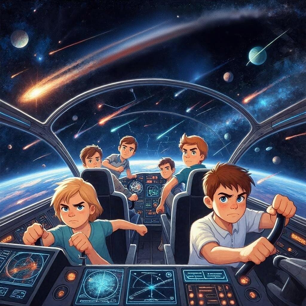 Глава первая: Начало пути Далеко-далеко, в маленьком городке на окраине нашей Галактики жил мальчик по имени Макс. У него была мечта — отправиться в путешествие по Вселенной вместе с друзьями. Однажды вечером, сидя дома перед старым компьютером, он случайно наткнулся на объявление: «Ищутся добровольцы для первого межгалактического путешествия подростков!» Сердце Макса забилось быстрее. Он тут же отправил заявку, надеясь стать частью команды отважных исследователей. Через неделю пришел ответ: его приняли! Так началась удивительная история путешествий подростковых команд... Глава вторая: Сбор экипажа Команда состояла из пяти ребят разного возраста и характера: Макс — лидер группы, обладающий острым умом и смелостью. Алисия — девочка с невероятной интуицией и способностью видеть скрытые опасности. Игорь — мастер техники, способный починить любую поломку. София — ботаник, изучающая жизнь растений даже на далеких планетах. Рома — веселый парень, ответственный за поддержание духа