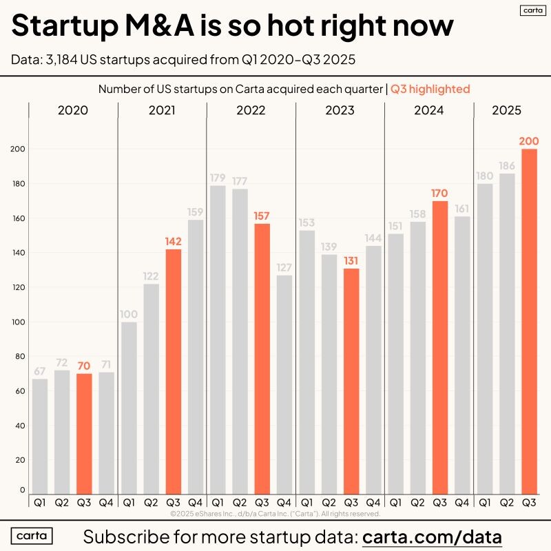 The M&A market for startups is heating up again! 🔥 Carta just reported a record-breaking 200 acquisitions in Q3 2025