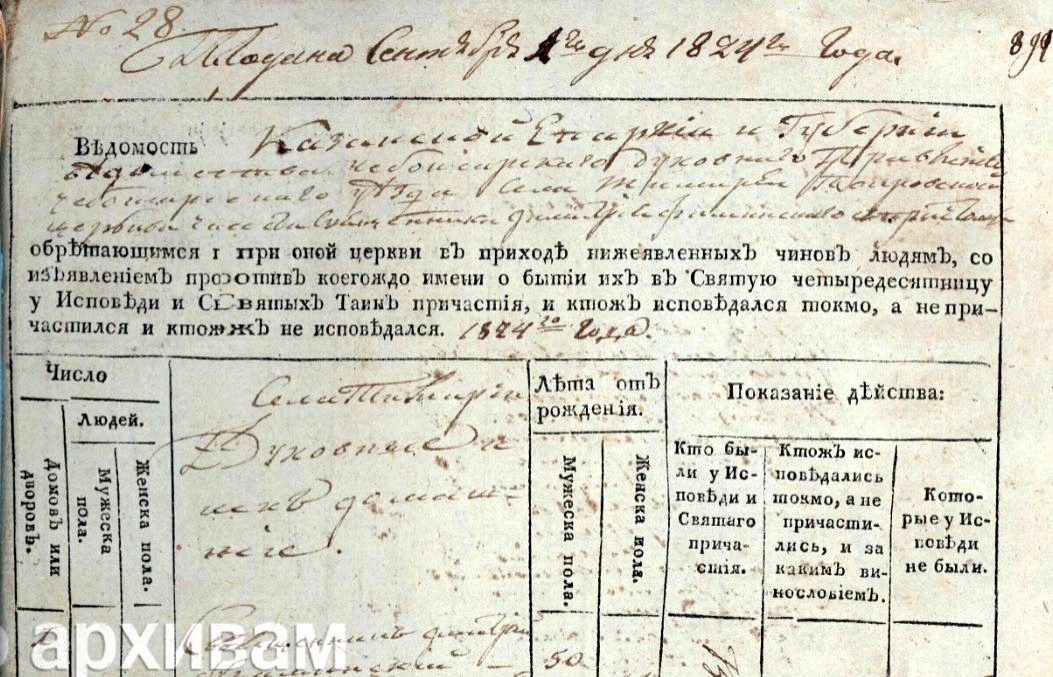 Государственный исторический архив Чувашской Республики. Фонд № 225, опись № 7, дело № 45. Стр. 824 скан. Подана сентября 1 дня 1824 года. Ведомость Казанской Епархии и Губернии ведомства Чебоксарского Духовного Правления Чебоксарского уезда села Тимирчей Покровской церкви части священника Димитрия Фаминского с причтом обретающимся при оной церкви в приходе нижеявленных чинов людям, со изъявлением против коегождо имени о бытии их в Святую Четыредесятницу у Исповеди и Святых Таин причастия и кто ж исповедался токмо, а не причастился, и кто ж не исповедался. 1824 года. Села Тимирчи духовные и их домашние. № 2. Дьячек Алексей Петров Васильевский. 22 лет. Жена Марья Васильева. 18. Мать его родная умершего дьячка Петра Иванова жена Ксения Иванова. 47. Сестра его девица Анна Петрова. 17. https://yandex.ru/archive/catalog/787d68ff-280b-48d7-b224-ab2bc4425110/894