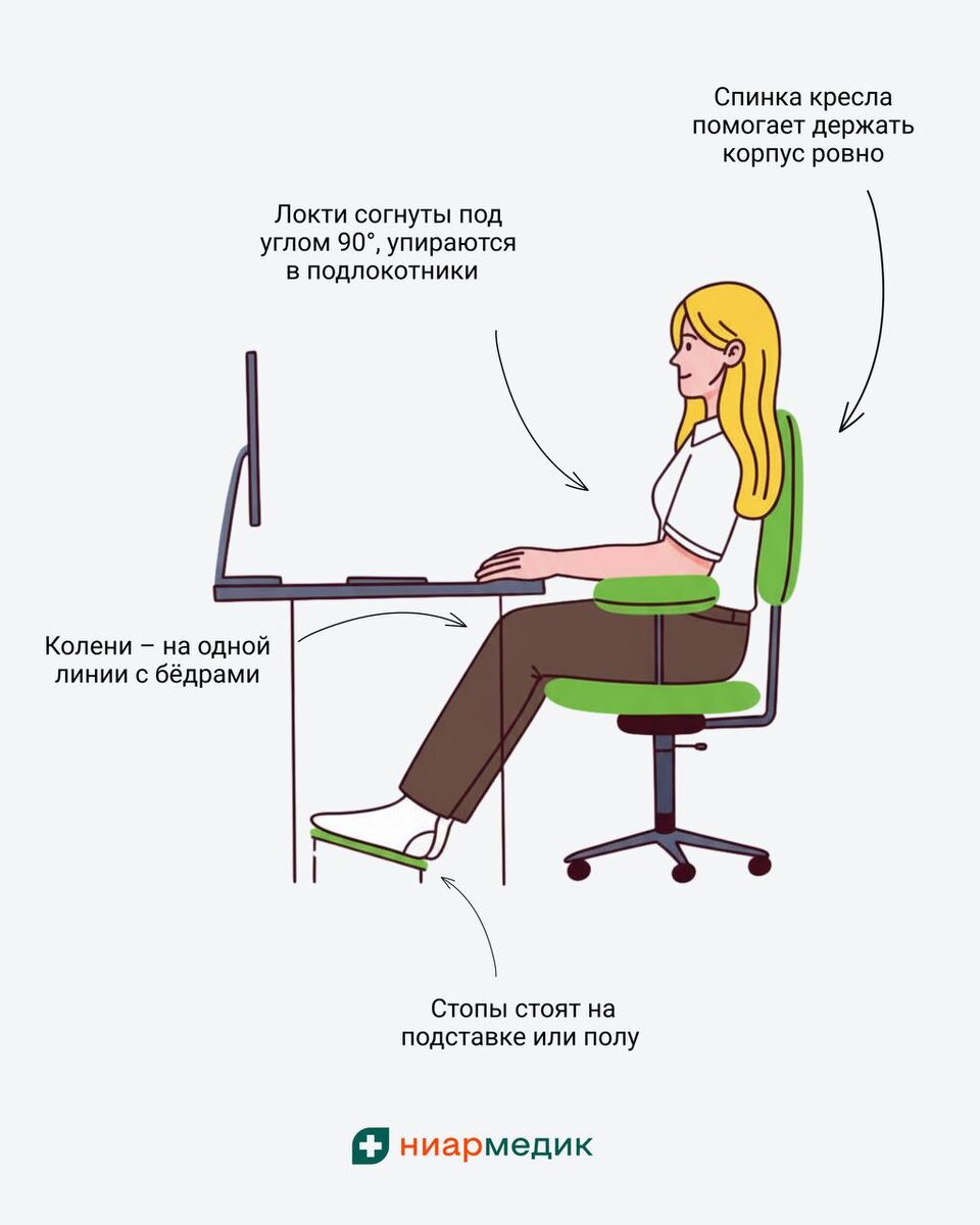 Как позаботиться о здоровье во время рабочего дня? 💼 Сохраните памятку! 🪑Настройте рабочее место так, чтобы было удобно сидеть и не приходилось напрягаться. На картинке показали, как правильно. 🕓 Разминайтесь каждый час — встаньте, походите, сделайте пару простых упражнений. 💡 Чаще проветривайте помещение, особенно если в офисе много людей. 👀 Соблюдайте правило 20-20-20: каждые 20 минут смотрите на объект на расстоянии около 6 метров в течение 20 секунд - так глаза меньше устают. 🥗 Не забывайте о сбалансированном питании, полезных перекусах и достаточном количестве воды в течение дня. Есть свои лайфхаки для комфортного рабочего дня? Делитесь! ❤️