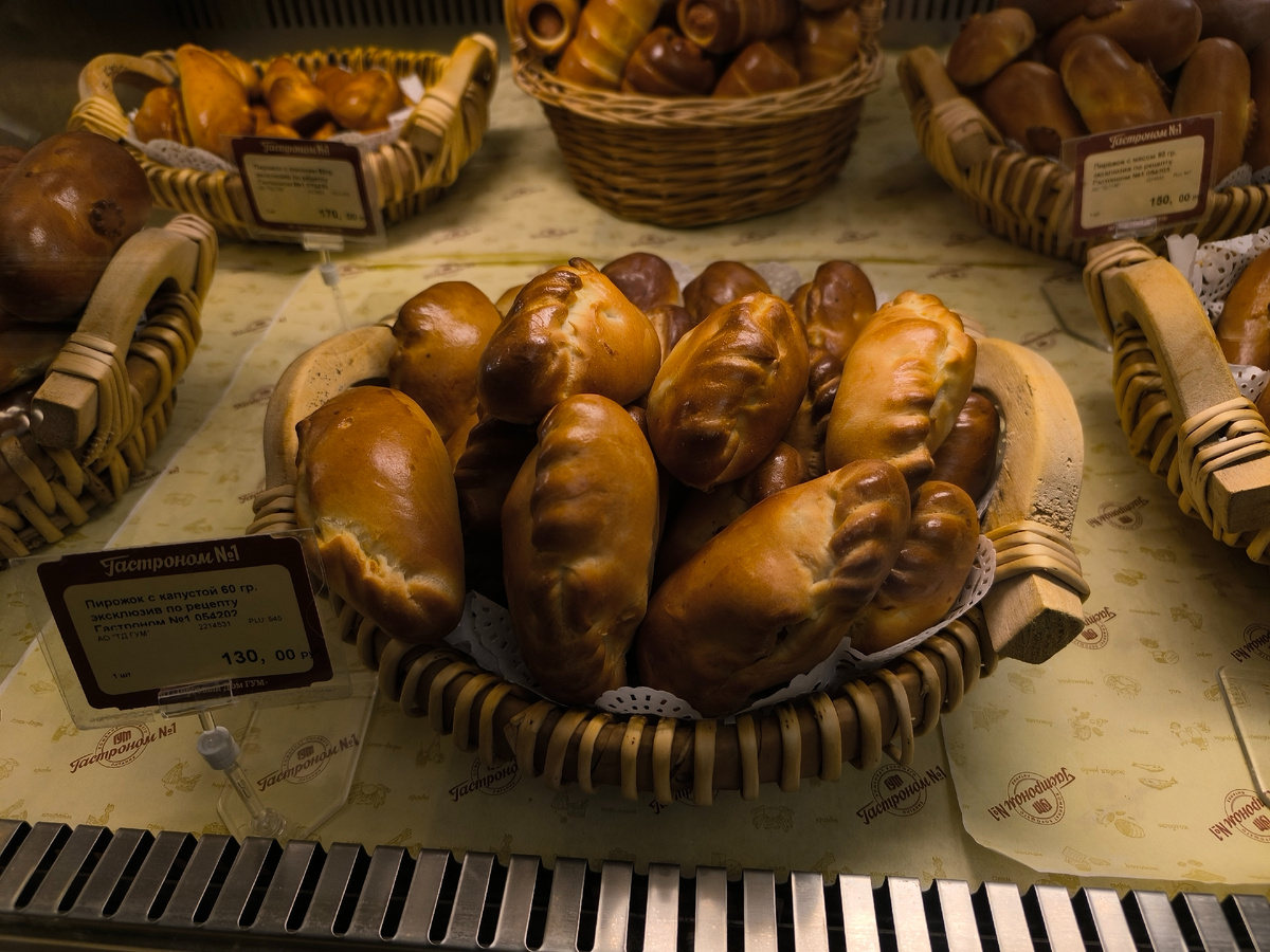 Сегодня у нас с вами будет небольшой фотопост. Гастроном в ГУМе можно назвать музеем. И это будет очень необычный музей, в котором можно купить продукты, блюда и десерты, приготовленные по ГОСТам времен СССР, которые помнят многие, кто родился и рос в этой великой стране. Гастроном сохраняет это культурное наследие и даёт возможность насладиться самим и угостить своих детей и внуков любимыми вкусняшками своего советского детства. В Гастрономе довольно много выпечки. Вот вам для примера фотография одного вида пирожков. Пирожок с капустой 130 рублей Пирожок с яблоком 130 рублей Торты и рулеты. Торт "Подарочный" по рецепту Гастронома 3200 рублей. Торт "Ленинградский" 3300 рублей Торт "Ландыш" 2600 рублей Торт "Птичка ГУМовская" 3200 рублей. Мороженое Эскимо с дубайским шоколадом 300 рублей Возле кассы полно новогодних наборов шоколада и сладостей. Скоро-скоро буду заполнять гостинцами подарочные мешочки. Шоколадные лошадки на палочке. Кандидаты в подарочные мешочки. Подарочны