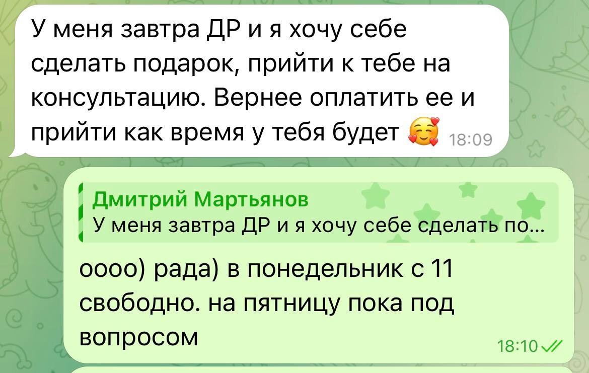 Мне вчера такое сообщение прислали, что я потом остаток вечера ходила и улыбалась🥰 Для меня то, что мои продукты выбирают в качестве подарка, всегда значило очень много. Это самое высшее подтверждение того, что я на правильном пути, как мне кажется. И я рада, что, спустя несколько лет метаний и поиска «того самого», я снова встала на верный Путь.