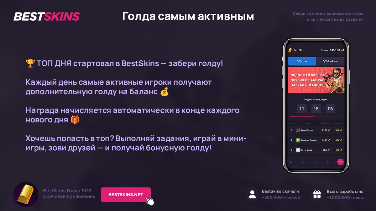 Топ дня в BestSkins SO2 Каждый день — бонус голды за активность! 💎 Чем выше в списке — тем жирнее награда 📈 🚀 Заходи и проверь своё место в ТОПе! 📲 Скачать - https://bestskins.net