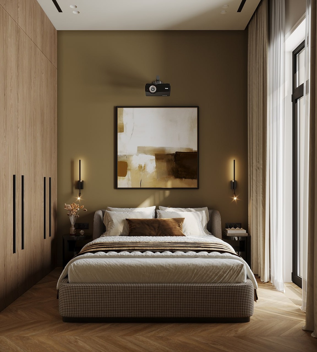 " Я обычно не даю своим проектам какие-то поэтические названия, как-то это не в моем ДНК. Но этот проект особенный! Потому что делаем мы его в партнерстве с потрясающим дизайнером Александрой Кудрявцевой и собственно именно Александра придумала это название )) Александра - очень талантливый инженер-проектировщик, автор тренингов, прекрасный спикер на тему всех технических вопросов в интерьере. А тут, хоть и однушечка, но есть над чем подумать... Например, высота потолка в помещении оказалась 3,8 м, что стало сюрпризом, даже для самих клиентов. Это дало возможность сделать канальное кондиционирование без волнений за опуск потолка, что понятно дело - плюс, но есть и минусы. Буду рассказывать в процессе. А сегодня смотрим визуализации спальни - королевы уюта и тишины. Клиенты очень просили заменить телевизор на проектор, но из-за высоченного потолка, мы не могли прикрепить его на потолок, и, чтобы не делать огромную трубу с потолка, решили прикрепить его к стене, хоть он и немного