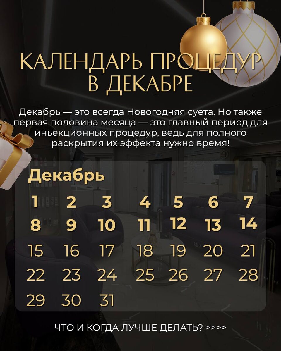 Начало декабря — это лучший период для инъекционных процедур, ведь для полного раскрытия их эффекта нужно время! Что и когда лучше делать, чтобы успеть подготовиться к праздникам? Смотрите в нашей карусели 👉🏼