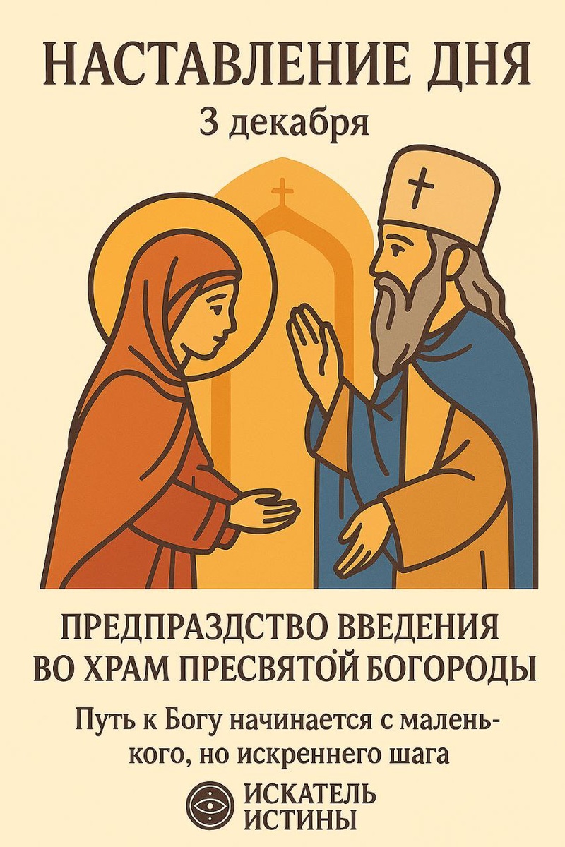 ☦️ Наставление дня — 3 декабря Предпразднство Введения во храм Пресвятой Богородицы В этот день Церковь тихо готовит нас к великой радости — вступлению Пречистой Девы в Дом Господень. Маленькая Мария вошла в храм с чистым сердцем и полной отдачей Богу. Пусть и ты сегодня сделаешь шаг навстречу Господу: очисти мысли, успокой сердцеи впусти в него свет Божией благодати. Путь к Богу начинается с маленького, но искреннего шага.