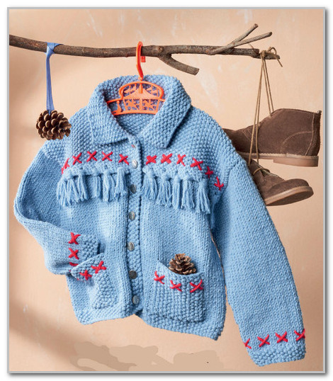 Сборка: вышить красной пряжей "крестики" по спинке и полочкам, по рукавам и верхней стороне карманов. Сшить плечевые швы. Пришить край набора воротника к закрытым петлям в горловине. Пришить рукава. Сшить боковые и рукавные швы. Пришить пуговицы. Для бахромы нарезать пряжу на нити по 16 см длиной. По 3 нити продеть в дырочки на канте. Смотреть как сделать бахрому здесь.