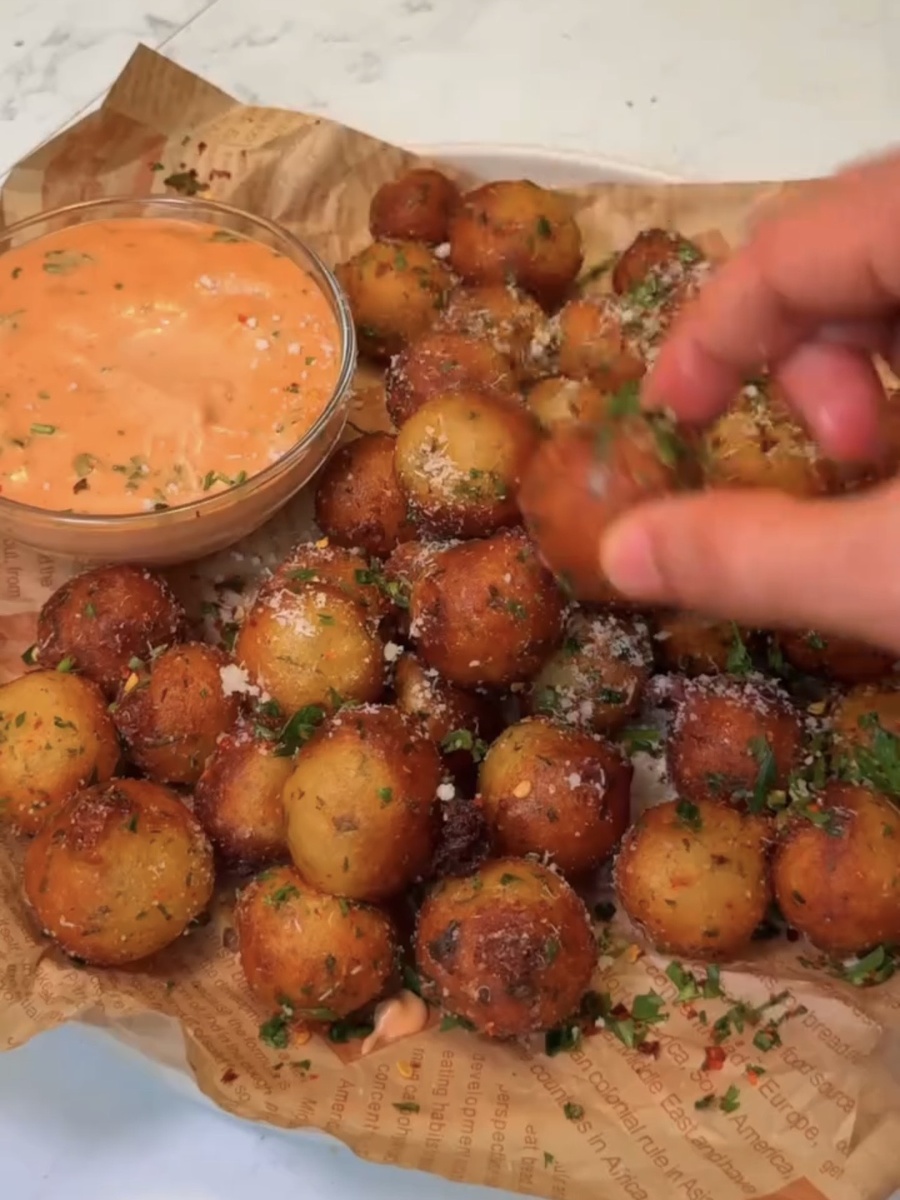 🔗Видео-рецепт в конце статьи🎥 Эта горячая закуска — находка для тех, кто любит простые ингредиенты, но яркий результат. Снаружи — золотистая хрустящая корочка, внутри — нежное картофельное пюре с ароматными специями и свежей зеленью. И всё это дополняет остро-сливочный соус Sriracha Mayo. Если ищете идею для вечера, компании или постов с эффектным визуалом — это именно она. 🥔 Ингредиенты Для картофельных шариков: Картофель — 3 шт. (около 600 г) Кукурузный крахмал — 3 ст. л. Сушёный орегано — 2 ст. л. Чесночный порошок — 2 ч. л. Луковый порошок — 2 ч. л. Копчёная паприка — 2 ч. л. Молотый кумин — 1/2 ч. л. Свежая петрушка — 2 ст. л. (и немного для подачи) Соль и чёрный перец — по вкусу Растительное масло для жарки Для соуса: Веган-майонез — 1/2 стакана Соус Sriracha — 1/2 стакана 🔥 Как приготовить 1. Отварите картофель Залейте картофель водой, посолите и варите 12–15 минут до мягкости. Слейте воду и оставьте картофель в горячей кастрюле на пару минут, чтобы ушла лишняя вла